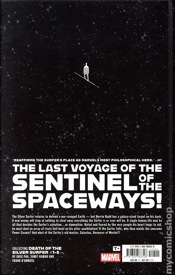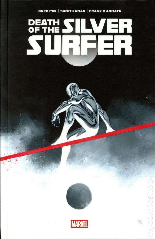 1st printing. Collects Death of the Silver Surfer (2025 Marvel) #1-5. Written by Greg Pak. Art by Sumit Kumar, Tiago Palma, and Jonas Trindade. Cover by Dike Ruan. The cosmos delivers its final verdict on one of Marvel's greatest heroes. The Silver Surfer is dead. Long live the Silver Surfer. Introducing an all-new hero to take up the mantle. The Silver Surfer returns to defend a war-ravaged Earth — but Norrin Radd has a galaxy-sized target on his back. A new enemy will stop at nothing to steal away everything the Surfer is or ever will be. A single human life may be all that decides the Surfers salvation…or damnation. Hated and feared by the very people his heart longs to aid, he must duel an array of rivals hellbent on his utter annihilation! If the Surfer falls, who then wields the awesome Power Cosmic? And what of the Surfers old master, Galactus, Devourer of Worlds?! Plus, with the death of the Silver Surfer, will there be a new wielder of the power cosmic to take his place? Hardcover, 128 pages, full color. Rated T+ Cover price $22.00.
