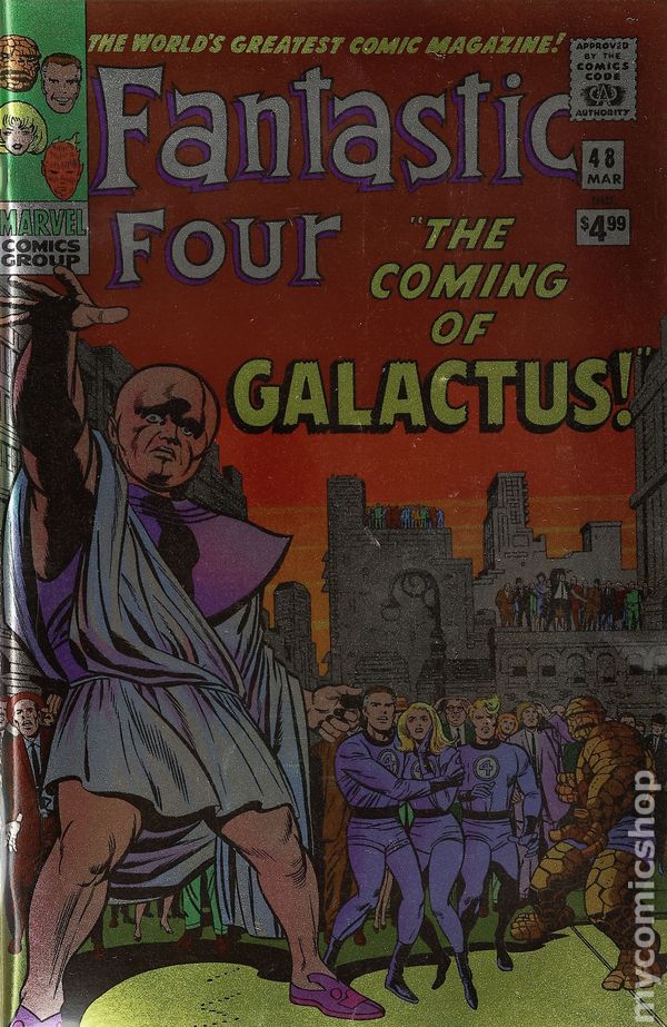 Written by Stan Lee. Cover and Art by Jack Kirby. The astonishing first chapter of the all-time-classic saga that fans call the Galactus Trilogy! Everything changes for the Fantastic Four - and the entire Marvel Universe - when they meet the enigmatic Silver Surfer, herald to the world-eating Galactus! The FF are still reeling from being caught between the Inhumans and Black Bolt's treacherous brother, Maximus the Mad, when the sky above New York City is seemingly engulfed in flame - and soon the Watcher arrives with a portent of doom. The Silver Surfer, wielder of the awesome Power Cosmic, is on his way to Earth as the advance scout for one of the most powerful entities in the universe. And when the being known as Galactus arrives, this world will be his next meal! It's one of the all-time great Marvel comic books, boldly re-presented in its original form, ads and all! Reprinting FANTASTIC FOUR (1961) #48. Marvel is reprinting the original Galactus trilogy as it originally appeared, over the next three months! 32 pages, full color. Cover price $4.99.