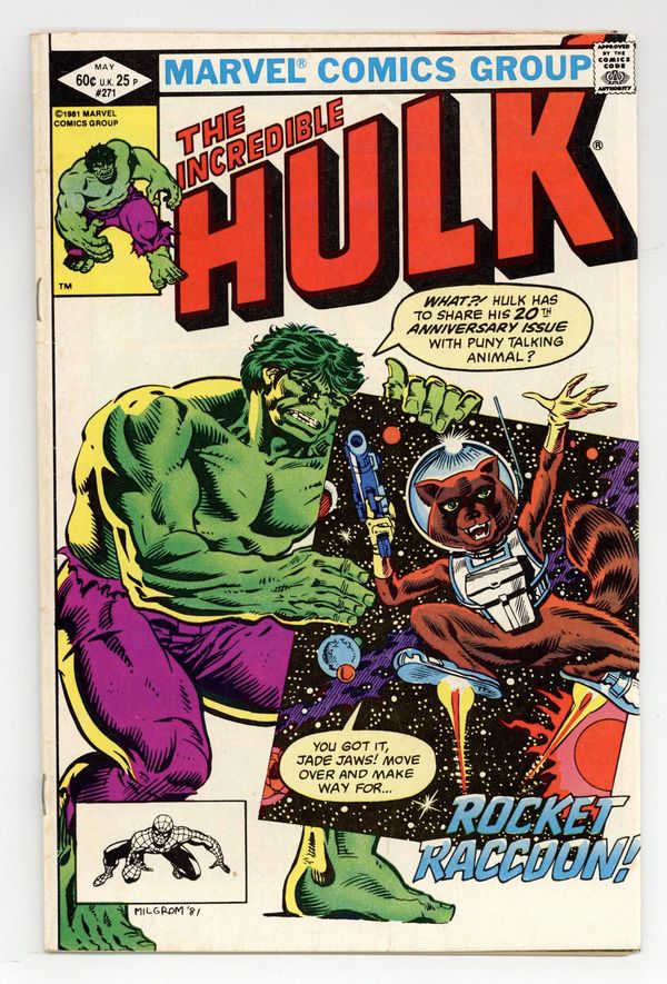 Starts Mar 23 Direct Edition. 2nd appearance of Rocket Raccoon (see Marvel Preview #7 for 1st appearance). Story by Bill Mantlo. Art by Sal Buscema. The Hulk celebrates his 20th Anniversary with one of the most offbeat stories of all. Following the events of last issue, Hulk hurtles through the void only to run into the marvelous Rocket Raccoon and his band of colorful friends. Can the Hulk aid Rocket and his crew against the machiavellian Judson Jakes and his sinister scientist, the tortoise Uncle Pyko? 36 pages. Cover price $0.60.