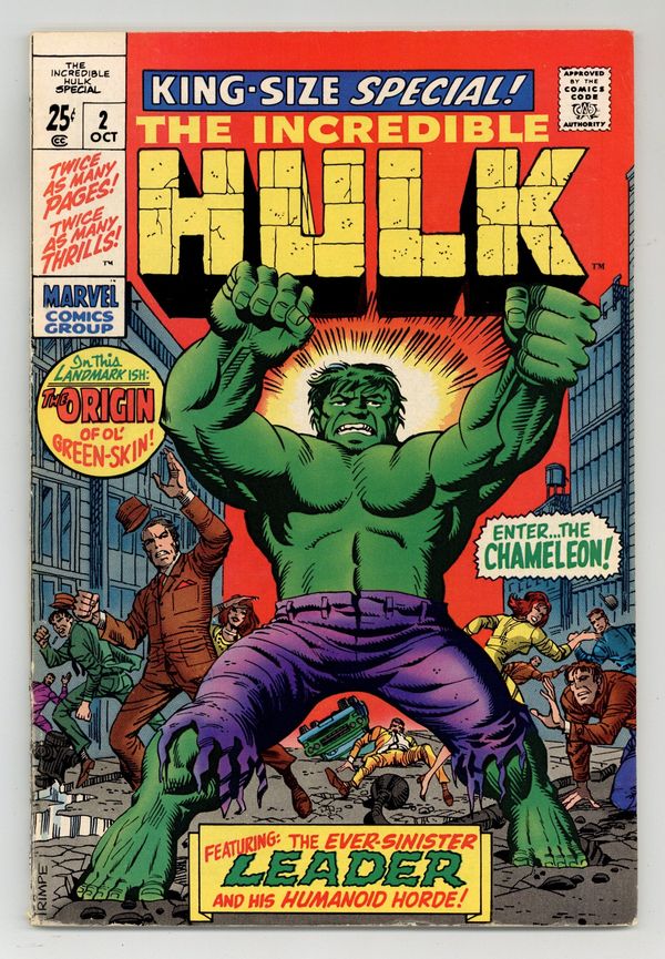 Starts Mar 23 Featuring "The Origin of the Hulk!" by Stan Lee and Jack Kirby. Then, the Hulk matches his brawn against the mad genius of the Leader in a 5 part epic. "Enter the Chameleon!" "A Titan Rides the Train!" "The Horde of Humanoids!" "On the Rampage Against the Reds!" And, "The Power of Doctor Banner!" Captain America cameo. Story by Stan Lee. Art by Steve Ditko, George Bell, Dick Ayers, and Vince Colletta. Cover by Herbe Trimpe. 68 pages. Cover price $0.25.