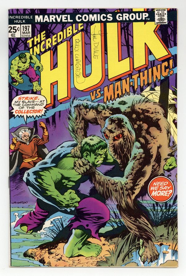 Starts Mar 23 Cover by Bernie Wrightson. "...And Man-Thing Makes Three!," script by Len Wein, pencils by Sal Buscema (breakdowns) and Joe Staton (finished art), inks by Joe Staton; Following his battle with the Abomination, the Hulk finds himself in the Florida Everglades, and he is not happy; As he tromps through the swamp he is completely unaware that his presence has attracted the attention of the Man-Thing, who watches the brute silently; The Hulk is attacked by various alligators and snakes, prompting the Hulk to angrily ball them up and toss them away; He then stumbles across the ruins of Omegaville; The Hulk battles the Man-Thing. Guest-starring Doc Samson, the Glob, the Collector, and Cap'n Cutlass (Horatio Cutlass). Marvel Value Stamp series B #51. 36 pgs., full color. $0.25. Cover price $0.25.