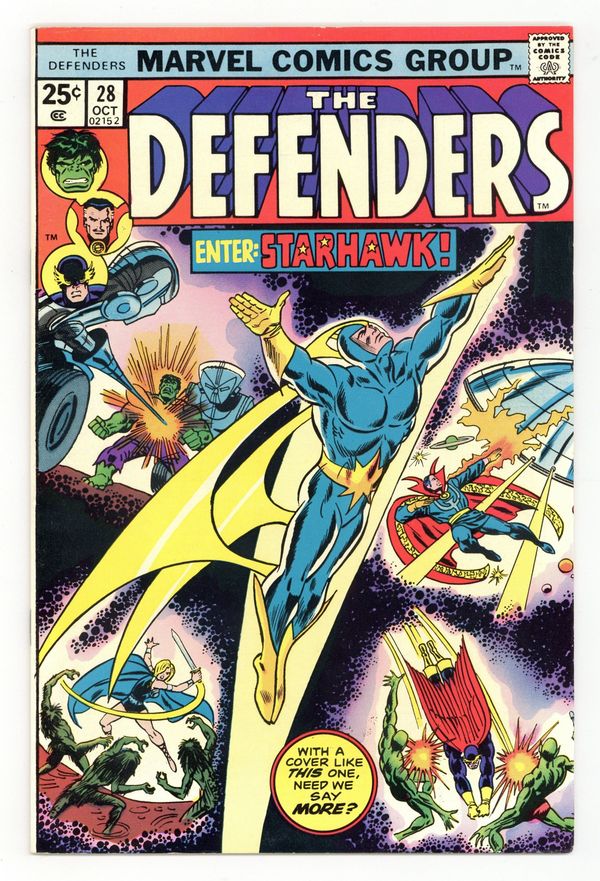 Starts Apr 20 Cover pencils by Ron Wilson, inks by Frank Giacoia. First full appearance of Starhawk in My Mother, The Badoon!, script by Steve Gerber, pencils by Sal Buscema (layouts/breakdowns), Frank Giacoia (Finished Art), and John Tartaglione [as John Tartag] (Finished Art), inks by Frank Giacoia and John Tartaglione [as John Tartag]; Nighthawk, Charlie-27 and Martinex are captured by the Badoon; Starhawk helps Vance Astro and Valkyrie return to Earth; Hulk and Yondu are forced to enter the Super-Death Sweepstakes. 36 pgs. $0.25. Cover price $0.25.