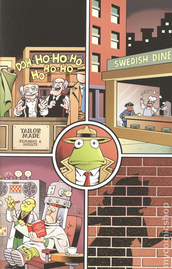 Limited 1 for 10 Retailer Incentive Variant Cover. (W) Roger Langridge (A) Roger Langridge (CA) Declan Shalvey IT WAS A DARK AND FROGGY EVENING! Its time to cue the music; its time to dim the lights! Its time to get things started as the Muppets return tonight! The show is about to begin at the famous Muppet Theatre, and the regular pre-curtain chaos has the troupes stalwart MC, Kermit the Frog, coming apart at the seams. In an attempt to de-stress, he settles down to read a few pages of a favorite old detective novel — only to get kayoed by an errant brick to the bean, leaving him laid out backstage as his co-stars try to coax him back to consciousness. But unbeknownst to them, Kermit has taken up the hard-boiled mantle of his fictional hero to walk the darkened streets of Dreamland, righting wrongs and cracking cases under the concealing cover of night. Flip Minnow, P.I., has no time for song and dance — not if hes going to solve the baffling mystery of the Snoozing Sleuth! Legendary cartooning talent and Muppets comics veteran ROGER LANGRIDGE bellies up to the drawing table once more for an all-new tale of crime and pun-ishment! 32 pages, full color, rated T. Cover price $4.99.
