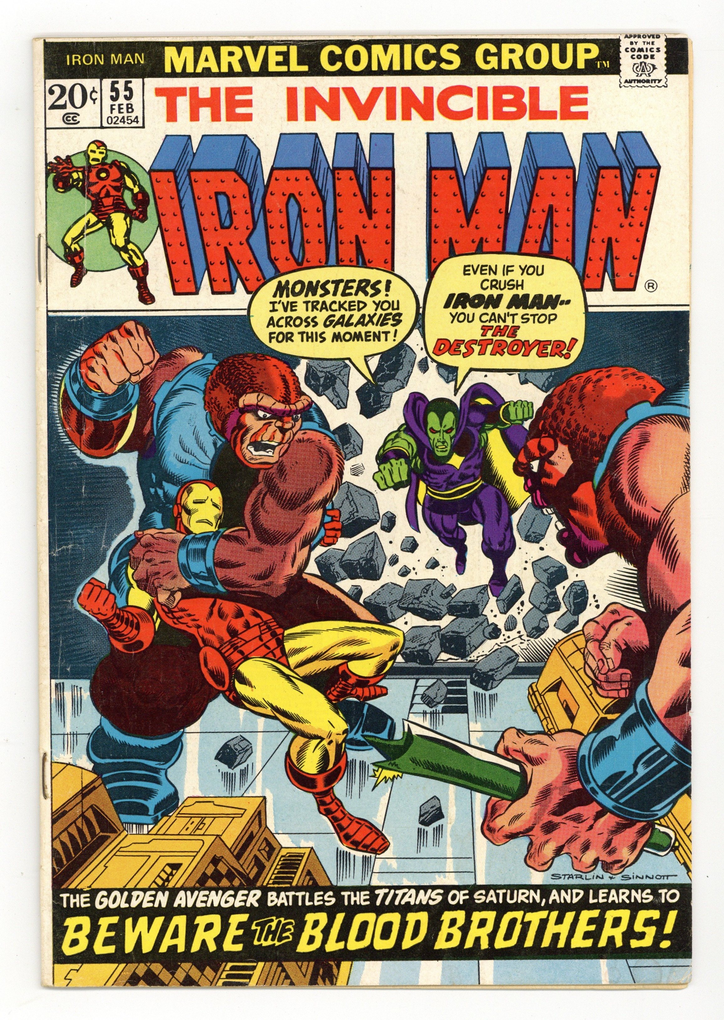 Starts Feb 2 "Beware the Blood Brothers!" First appearance of Thanos. Story by Jim Starlin. Art by Jim Starlin and Mike Esposito. Cover by Jim Starlin and Joe Sinnott. One of the landmark Marvel issues of the Bronze Age. Drax the Destroyer is a prisoner of Thanos at the evil Titan's Earth-fortress. In an effort to escape, Drax telepathically reaches out to Tony Stark for assistance; but before Iron Man can come to the rescue, Shell-Head is ambushed by the Blood Brothers! Can Drax and the golden avenger defeat the Blood Brothers and Thanos? Also first appearances of Drax the Destroyer, Starfox (in a flashback), and Mentor. (Note: Iron Man 55 was reprinted as a Marvel Milestone Edition in 1992.) 36 pages Cover price $0.20.