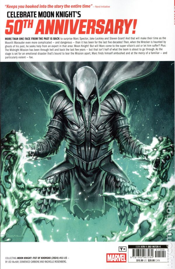 Volume 3 - 1st printing. "We're Outta Here!" Collects Moon Knight: Fist of Khonshu (2024 Marvel) #11-15. Written by Jed MacKay. Art by Domenico Carbone. Cover by Davide Paratore. Celebrate Moon Knights 50th anniversary! More than one face from the past is back to surprise Marc Spector, Jake Lockley and Steven Grant! And that will make their time as the Moonlit Marauder even more complicated — and dangerous — than it has been for the last five decades! Softcover, 112 pages, full color. Rated T+ Cover price $15.99.