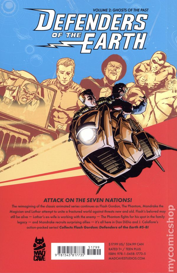 Volume 2 - 1st printing. "Ghosts of the Past!" Collects Defenders of the Earth (2024 Mad Cave) #5-8. Written by Dan DiDio. Art by Jim Calafiore, Matt Horak, Brent Schoonover, and Sal Velluto. Cover by Jim Calafiore. Assault on the Seven Nations! The reimagining of the classic animated series continues as Flash Gordon, The Phantom, Mandrake the Magician and Lothar attempt to unite a fractured world against threats new and old. Flash's beloved may still be alive -- Lothar's ex-wife is working with the enemy -- The Phantom fights for his spot in the family legacy -- and Mandrake recruits surprising allies -- it's all here in Dan DiDio and J. Calafiore's action-packed series! Softcover, 112 pages, full color. Teen Cover price $17.99.