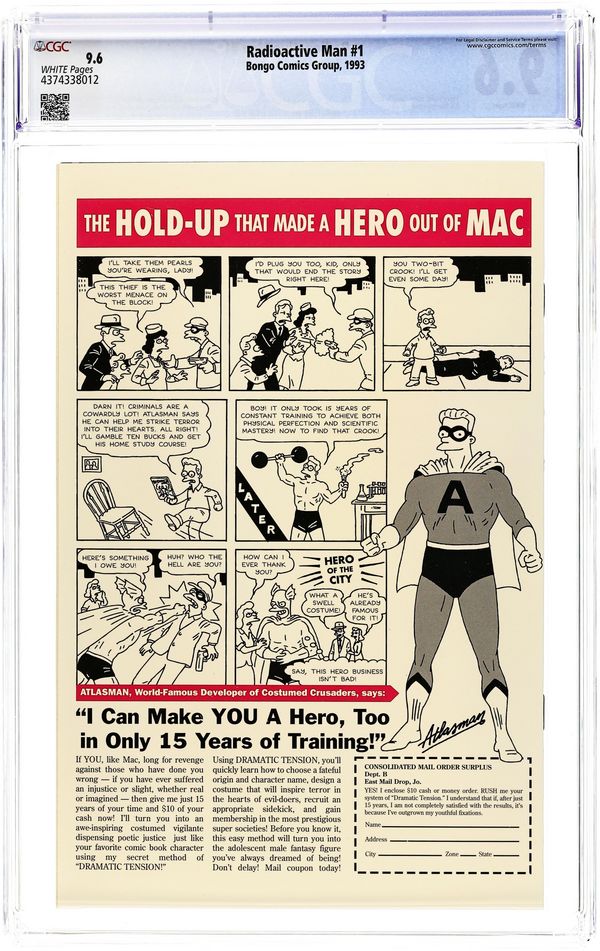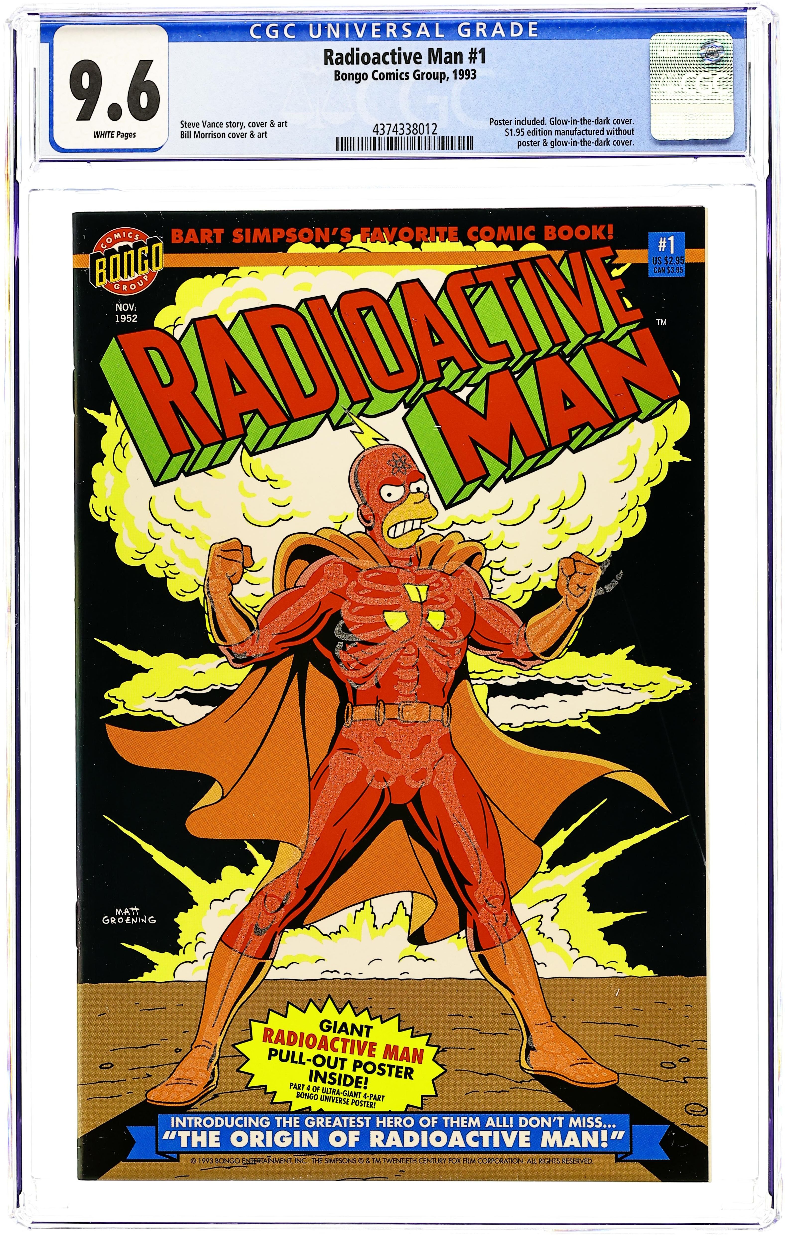 Starts May 4 Glow in the dark cover, pencils by Steve Vance, inks by Bill Morrison. #1 has a May, 1952 cover date (although the comic was actually published in 1994). Homer Simpson of the Simpsons as Radioactive Man! The Origin of Radioactive Man, script by Cindy Vance (Plot) and Steve Vance (Plot & Script), pencils by Steve Vance (Layout) and Bill Morrison (Finishes), inks by Bill Morrison. Dr. Crab's Commie Comics, script by Cindy Vance (Plot) and Steve Vance (Plot & Script), pencils by Steve Vance (Layout) and Bill Morrison (Finishes), inks by Bill Morrison; Abandoned Warehouse District; Atom Smasher Ray; CCCP [Cartoon Conduct Code Program]; comics [Hartley; Crime Does Pay; Finger's House of Giant Props; Gloria Grand Show; Gold Record; Headlight; Lurid; Mount Zenith; Smart Mouth Comics]; Soviets; Stab Comics; Tales of Revolting Filth; the Containment Dome; the Geodesic Dome; US Congress; Vile; WZEN; Zenith Seafood Service. Jumbo poster insert. 36 pgs. $2.95. Cover price $2.95.