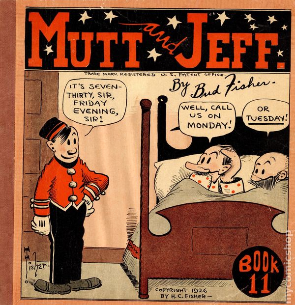 Publication date may be incorrect. Various issues in this serious may have been reprinted several times, each with a new publication date along with different ad pages, and with the first printing publication date and later reprint date as yet unknown. Mutt and Jeff (1919-33 Cupples & Leon) Book #11 by H.C. "Bud" Fisher, copyright 1926. 10" x 10", 52pg, B&W