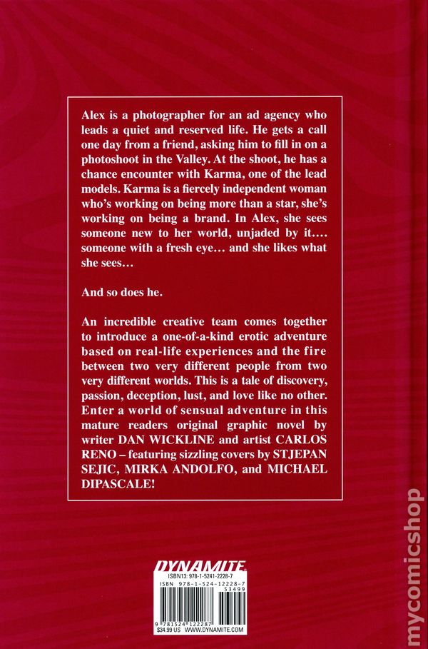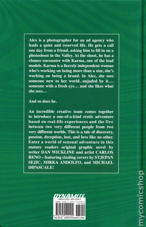 1st printing. Written by Dan Wickline. Art by Carlos Reno. Cover by Michael DiPascale. Alex is a photographer for an ad agency who leads a fairly quiet and reserved life. He gets a call one day from a friend, asking him to fill in on a photoshoot in the Valley. The swimwear shoot is on a set where he has a chance encounter with Karma, one of the lead models. Karma is fiercely independent woman who is working on being more than a star, but a brand. In Alex she sees someone new to her world, unjaded by it. Someone with a fresh eye... and she thinks it could be fun opening his mind to new adventures. This new edition features cover art by Michael DiPascale, known for his covers on titles published by BOOM! Studios, Avatar Press, Coffin Comics and ZeneScope. Hardcover, 128 pages, full color. Mature Readers Cover price $34.99.