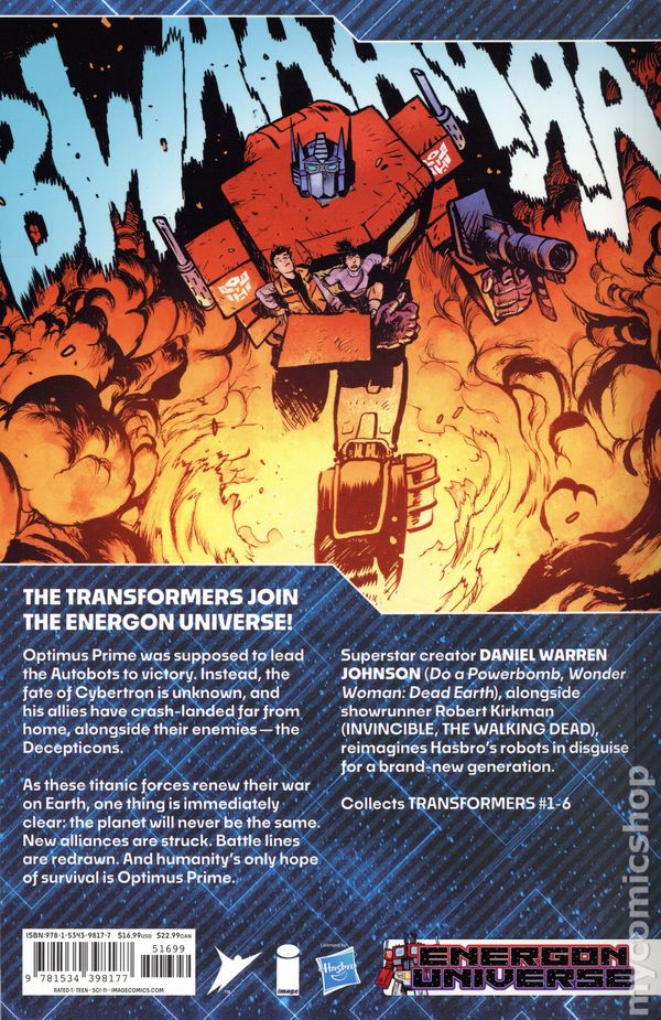 Volume 1 - 1st printing. "Robots in Disguise!" Collects Transformers (2023 Image) #1-6. Story and art by Daniel Warren Johnson. The Transformers Join The Energon Universe!? Optimus Prime was supposed to have led the Autobots to victory. Instead, the fate of Cybertron is unknown, and his allies have crash-landed far from home, alongside their enemies-the Decepticons. As these titanic forces renew their war on Earth, one thing is immediately clear: the planet will never be the same. New alliances are struck. Battle lines are redrawn. And humanity's only hope of survival is Optimus Prime. Superstar creator Daniel Warren Johnson, alongside showrunner Robert Kirkman, reimagines Hasbro's robots in disguise for a brand-new generation. Softcover, 144 pages, full color. Rated T Cover price $16.99.