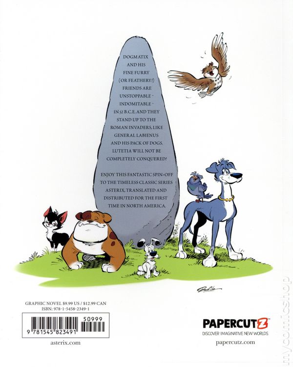 Volume 1 - 1st printing. "Show No Mercy to the Romans!" Created by Rene Goscinny and Albert Uderzo. Written by Yves Coulon, Matthieu Choquet and Jérôme Erbin. Art by Philippe Fenech and Jean Bastide. Cover by Philippe Fenech. Back Cover by Jean Bastide. Dogmatix and his fine furry (or feathery!) friends are unstoppable - indomitable - in 52 B.C.E. And they stand up to the Roman invaders, like General Labienus and his pack of dogs. Lutetia will not be completely conquered! Enjoy this fantastic spin-off to the timeless classic series ASTERIX, translated and distributed for the first time in North America. Softcover, 6 1/2-in.x 8-in., 80 pages, full color. All Ages Cover price $7.99.