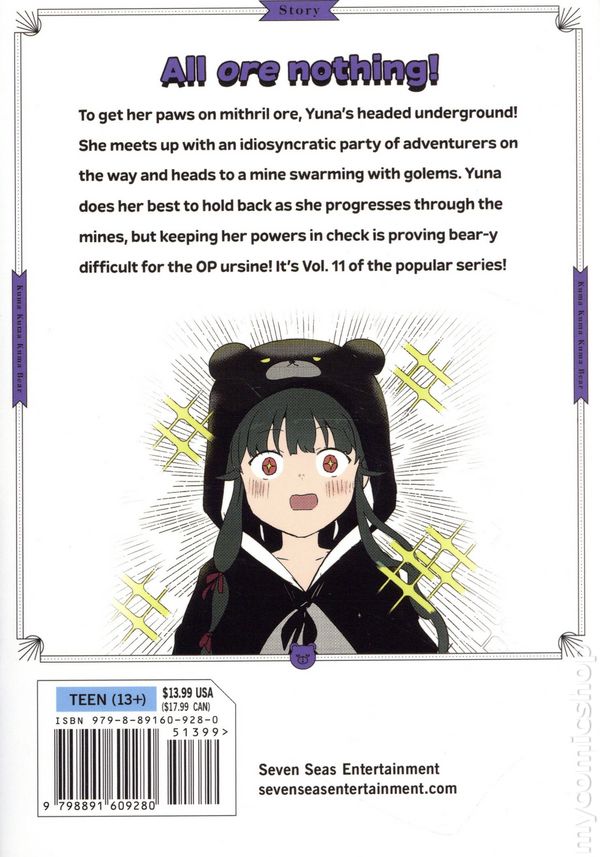 Volume 11 - 1st Printing. Written by Kumanano. Art and Cover by Sergei. Character design by 029. ALL ORE NOTHING! To get her paws on mithril ore, Yunas headed underground! She meets up with an idiosyncratic party of adventurers on the way and heads to a mine swarming with golems. Yuna does her best to hold back as she progresses through the mines, but keeping her powers in check is proving bear-y difficult for the OP ursine! Softcover, 5-in. x 7 1/2-in., 180 pages, B&W. Cover price $12.99.