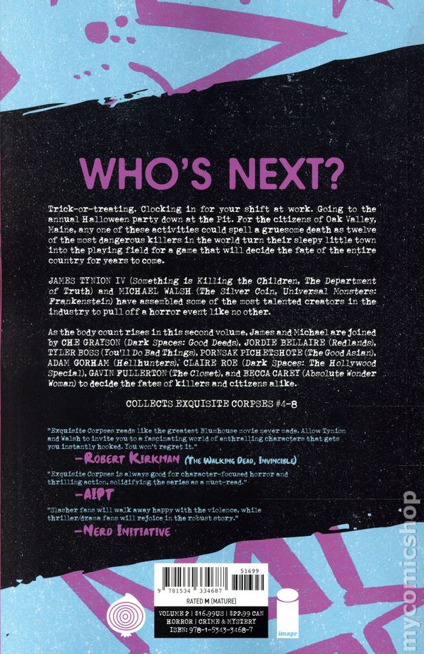 Volume 1 - 1st printing. Collects Exquisite Corpses (2025 Image) #1-3. Written by James Tynion IV, Michael Walsh, and Pornsak Pichetshote. Art by Michael Walsh, Marianna Ignazzi, and Valentine De Landro. Cover by Michael Walsh. Every five years on Halloween, the wealthiest families in America play a game. Twelve of the deadliest people in the world are dropped into a small town with just one goal: last killer standing wins. For the citizens of Oak Valley, Maine—this year's unlucky arena—the goal is much simpler. They must survive the night. Experience a comics event like no other from the minds of** JAMES TYNION IV** (Something is Killing the Children_, THE DEPARTMENT OF TRUTH) _& MICHAEL WALSH (THE SILVER COIN, UNIVERSAL MONSTERS: FRANKENSTEIN), as they lead a group of the most exciting voices in the industry. In this blood-soaked first volume, JAMES & MICHAEL are joined by PORNSAK PICHETSHOTE (THE GOOD ASIAN), MARIANNA IGNAZZI (Catwoman), and VALENTINE DE LANDRO (BITCH PLANET) to collaborate & compete to determine who wins...and who dies. Softcover, 144 pages, full color. Mature Readers Cover price $9.99.