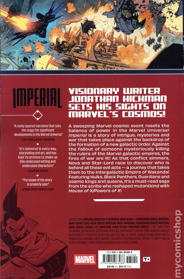 1st printing. Collects Imperial (2025 Marvel) #1-4. Imperial War: Nova - Centurion (2025 Marvel), Imperial War: Planet She-Hulk (2025 Marvel), Imperial War: Imperial Guardians (2025 Marvel), Imperial War: Exiles (2025 Marvel),and Imperial War: Black Panther (2025 Marvel). Written by Jonathan Hickman, Victor LaValle, Stephanie Phillips, Steve Foxe, Jed MacKay, and Dan Abnett. Art by Iban Coello, Federico Vicentini, Cafu, Emilio Laiso, Francesco Manna, Davide Tinto, Matteo Della Fonte, Cory Smith, and Luca Maresca. Cover by Marco Checchetto. Back Cover by Iban Coello and Federico Vicentini. Visionary writer Jonathan Hickman (Ultimate Spider-Man, Secret Wars) sets his sights on Marvels cosmos! A sweeping Marvel cosmic event resets the balance of power in the Marvel Universe! IMPERIAL is a story of intrigue, mysteries and war that takes place against the backdrop of the formation of new galactic order. Against the fallout of someone mysteriously killing the rulers of the Marvel galactic empires, the fires of war are lit! As that conflict simmers, Nova and Star-Lord race to discover who is behind all these evil acts — a journey that takes them to the Intergalactic Empire of Wakanda! Featuring Hulks, Black Panthers, Guardians and cosmic kings and queens, its a must-read saga from the scribe who reshaped mutantkind with HOUSE OF X/POWERS OF X! Softcover, 312 pages, full color. Rated T+ Cover price $34.99.