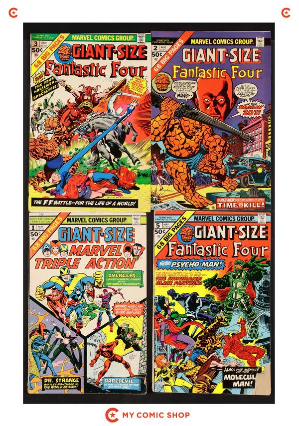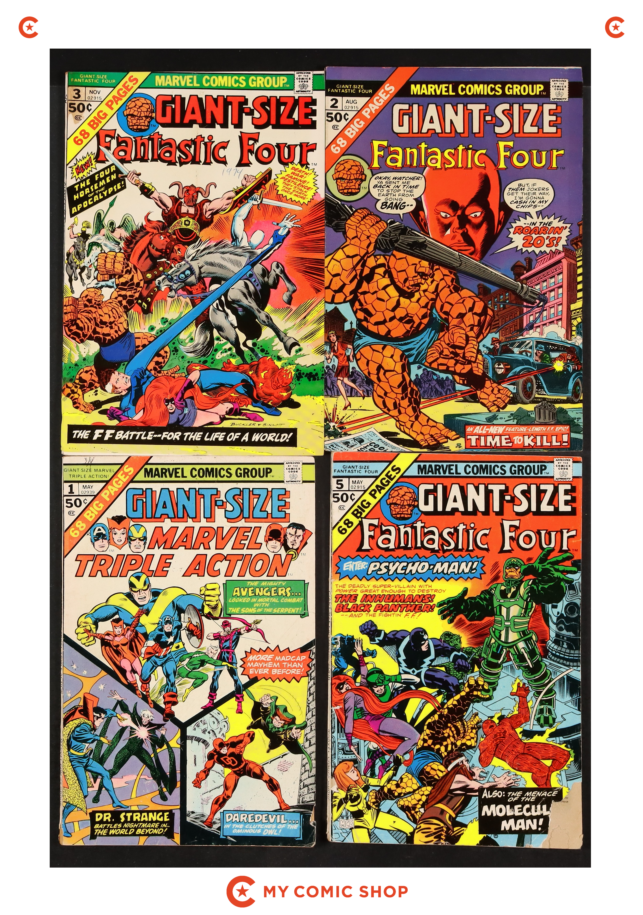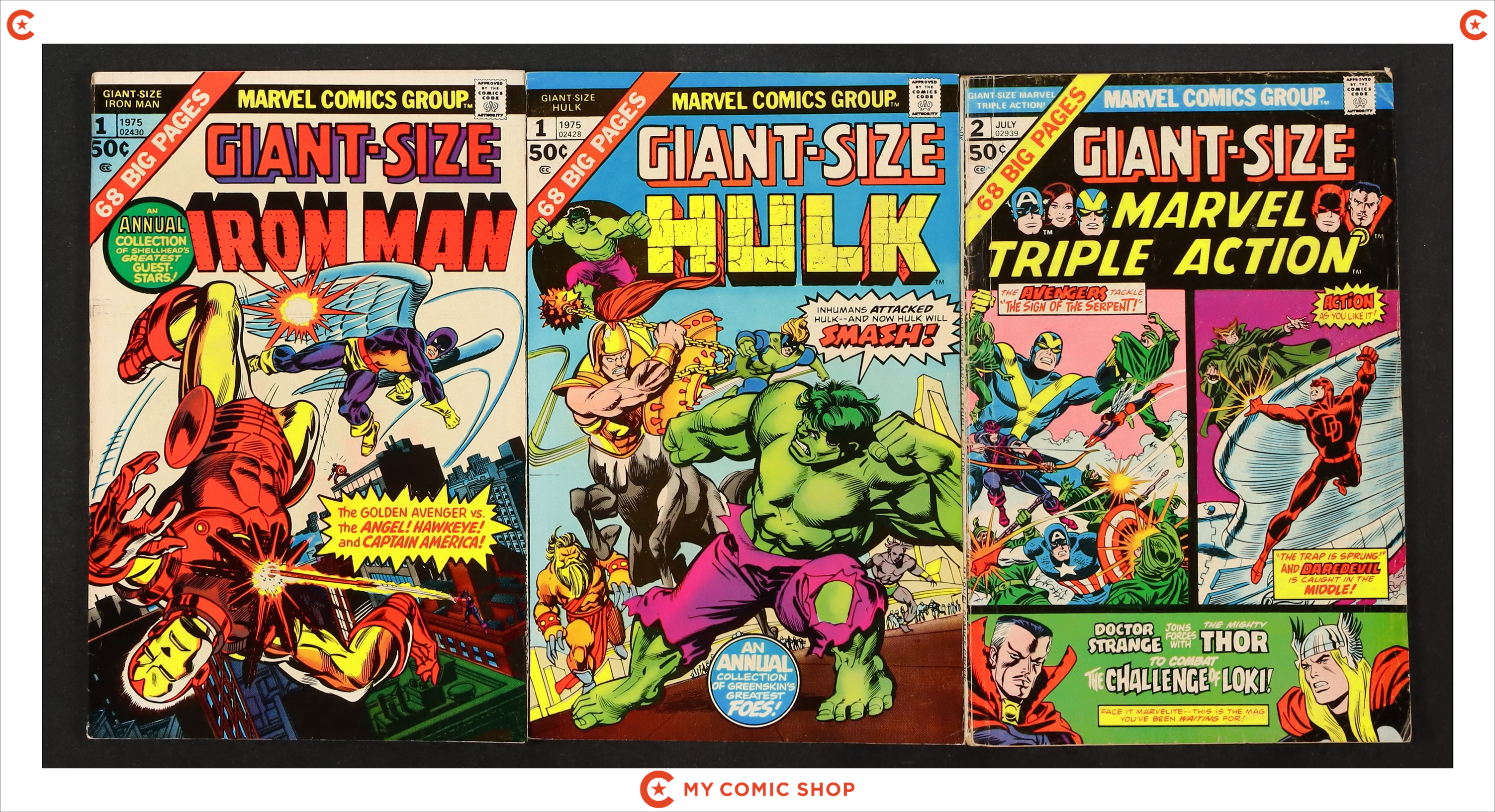 Issues 2, 3, 5 of Giant Size Fantastic Four (1974); 1, 2 of Giant Size Marvel Triple Action (1975); Giant Size Hulk (1975 1st Series) 1; and Giant Size Iron Man (1975) 1. Most will grade in the FR/GD to FN- range.