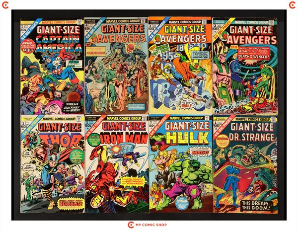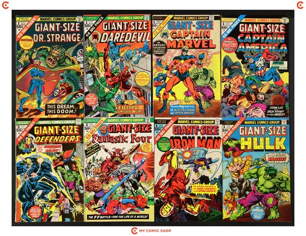 Issues Giant Size Captain America (1975) 1; Giant Size Captain Marvel (1975) 1; Giant Size Daredevil (1975) 1; Giant Size Doctor Strange (1975) 1; Giant Size Hulk (1975 1st Series) 1; Giant Size Iron Man (1975) 1; Giant Size Fantastic Four (1974) 3; and Giant-Size Defenders (1974) 5. Most will grade in the GD+ to VG/FN range.