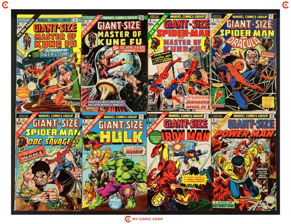 Issues 2, 4 of Giant Size Master of Kung Fu (1974); 1, 2 of Giant Size Super-Villain Team-Up (1975); Giant Size Super Heroes Featuring Spider-Man (1974) 1; Giant Size Thor (1975) 1; Giant Size X-Men (1975) 2; and Giant Size Spider-Man (1974) 3. Most will grade in the GD to VG range.