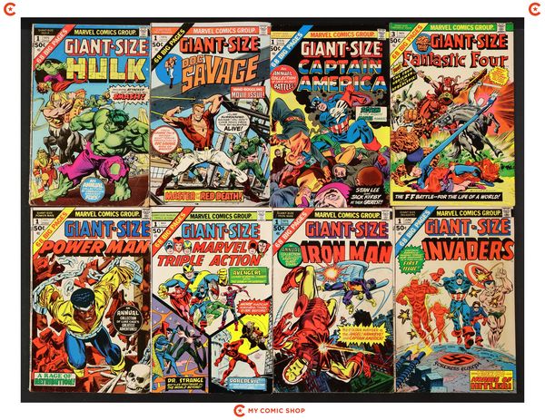 Issues Giant Size Fantastic Four (1974) 3; Giant Size Captain America (1975) 1; Giant Size Doc Savage (1975) 1; Giant Size Hulk (1975 1st Series) 1; Giant Size Invaders (1975) 1; Giant Size Iron Man (1975) 1; Giant Size Marvel Triple Action (1975) 1; Giant Size Power Man (1975) 1. Most will grade in the FR/GD to VG/FN range.