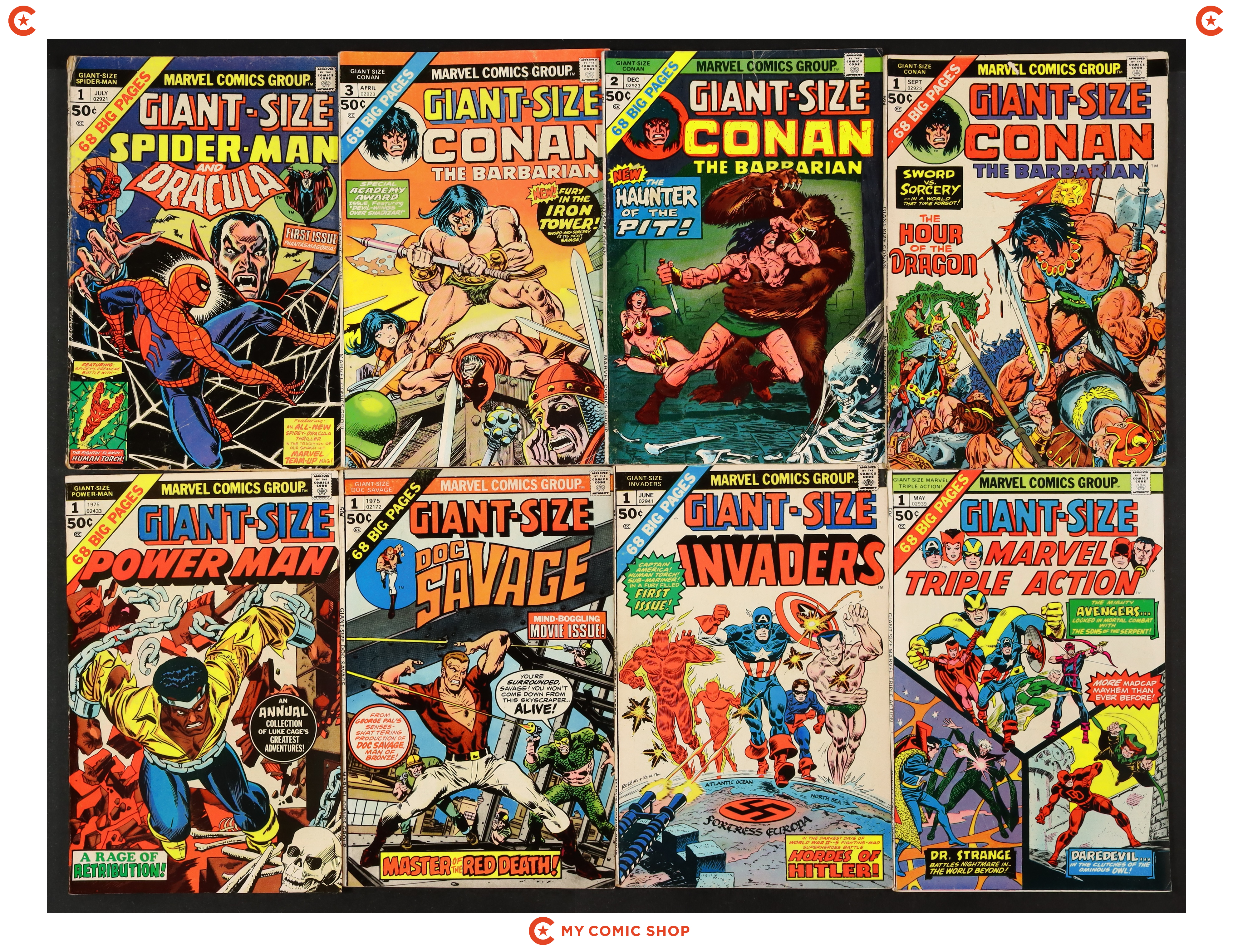 Issues 1-3 of Giant Size Conan (1974); Giant Size Spider-Man (1974) 1; Giant Size Marvel Triple Action (1975) 1; Giant Size Invaders (1975) 1; Giant Size Doc Savage (1975) 1; and Giant Size Power Man (1975) 1. Most will grade GD to FN range.