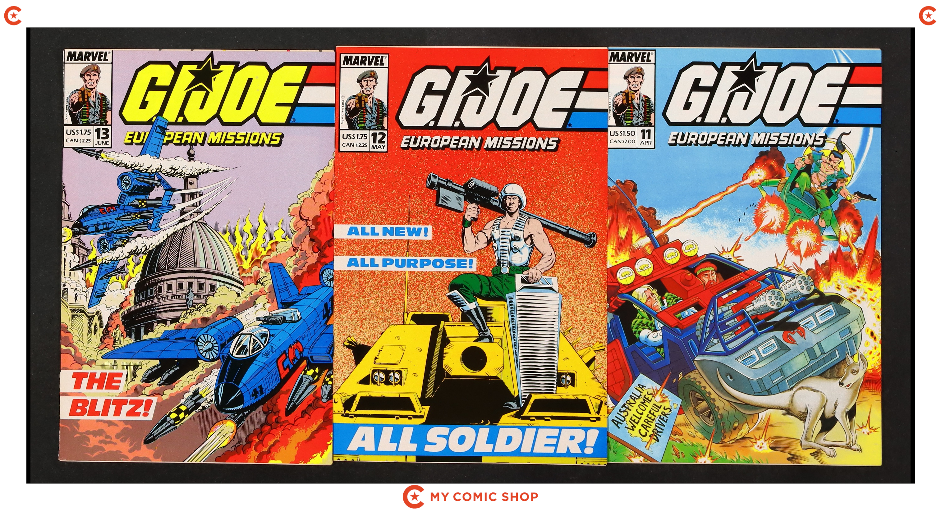 Issues 1-3 and 8-13 of GI Joe European Missions (1988). Most will grade in the NM to VF+ range.