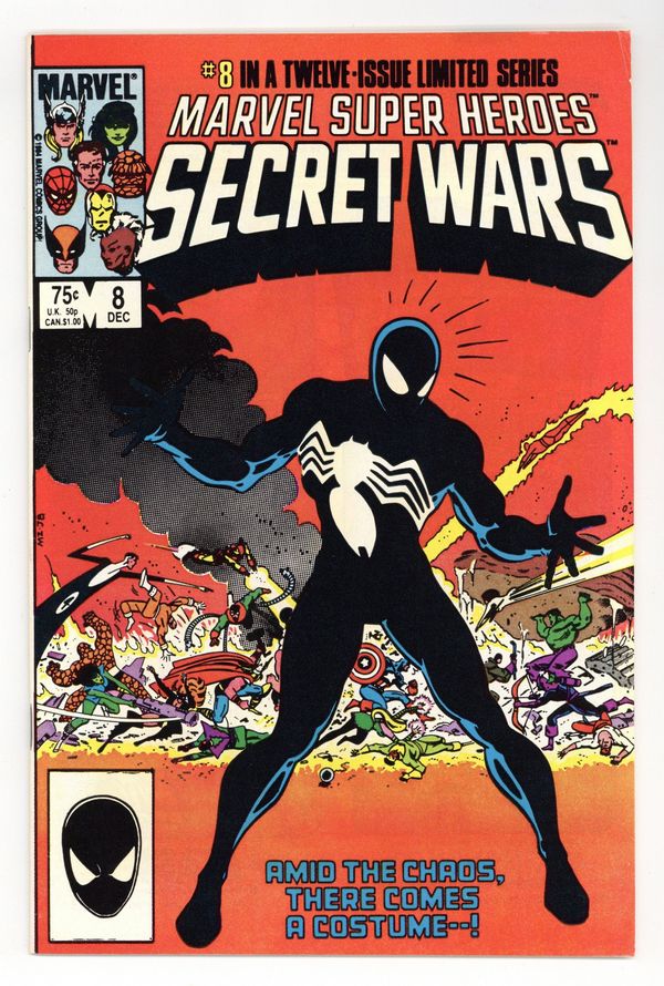 Starts Jan 3 Direct Edition. "Invasion!" Part 8 of 12. Story by Jim Shooter. Art by Mike Zeck, John Beatty, Jack Abel, and Mike Esposito. Tired of being the villains' punching bags, the heroes take the fight to their deadly foes' own doorstep. What follows is one of the most titanic super hero/villain tussles of all time. Plus, Spidey gets a new costume. 1st in continuity appearance of Spider-Man's black costume. See Amazing Spider-Man (Vol. 1) #252, Marvel Team-Up #141, & Spectacular Spider-Man #90 for the first appearances from 7 months earlier. NOTE: This costume turns out to be an alien symbiote that will later bond with Eddie Brock and become the tenacious Spidey villain known as Venom. See Amazing Spider-Man #300. 36 pages, full color. Cover price $0.75.