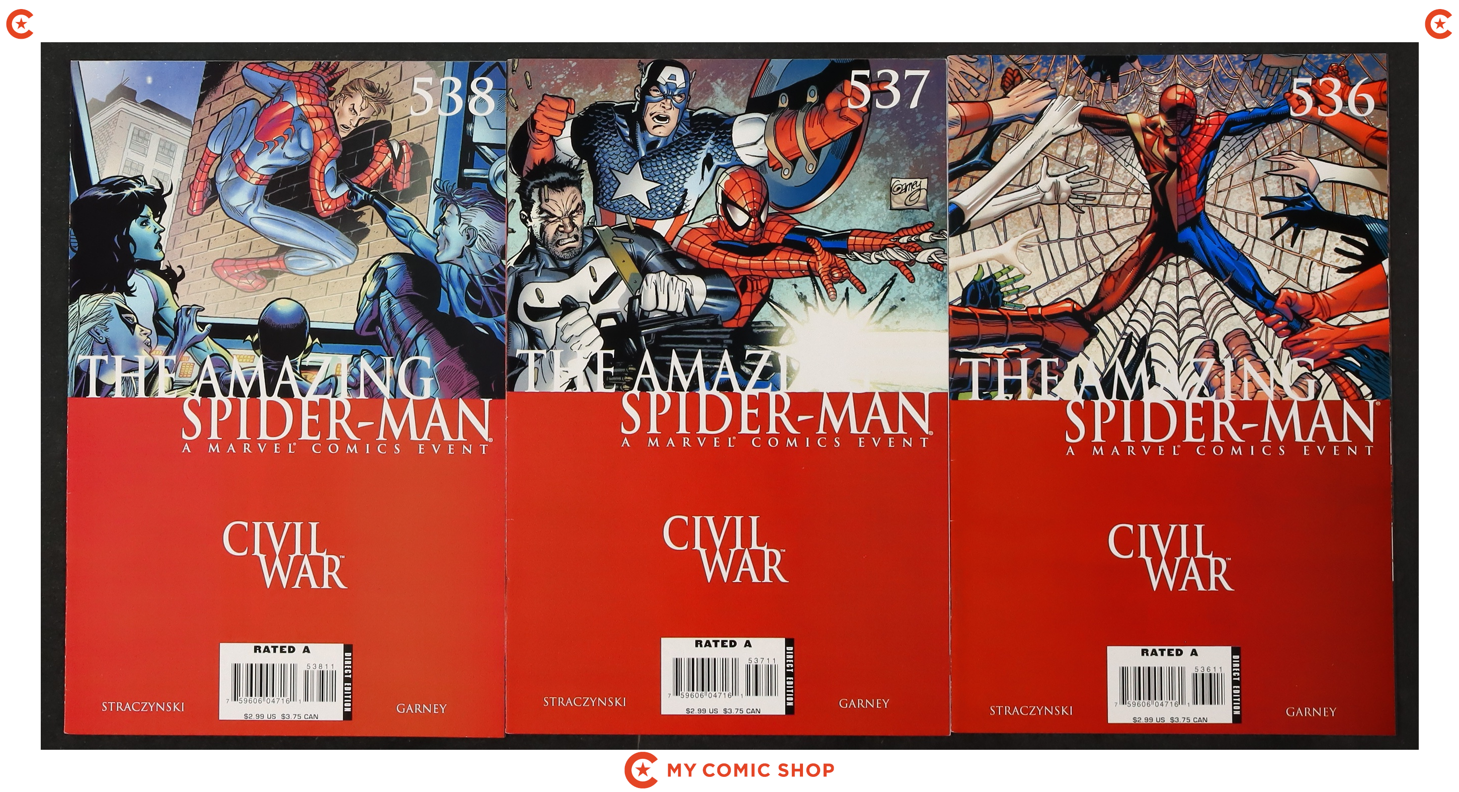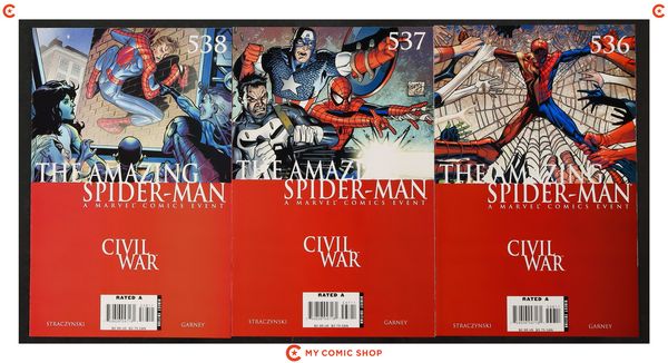 Issues 529C-532A, 533A, 534-537A, 538A of Amazing Spider-Man (1998 2nd Series) with 529C signed by Ron Garney. No autograph certification is included. Most will grade in the FN to VF range.