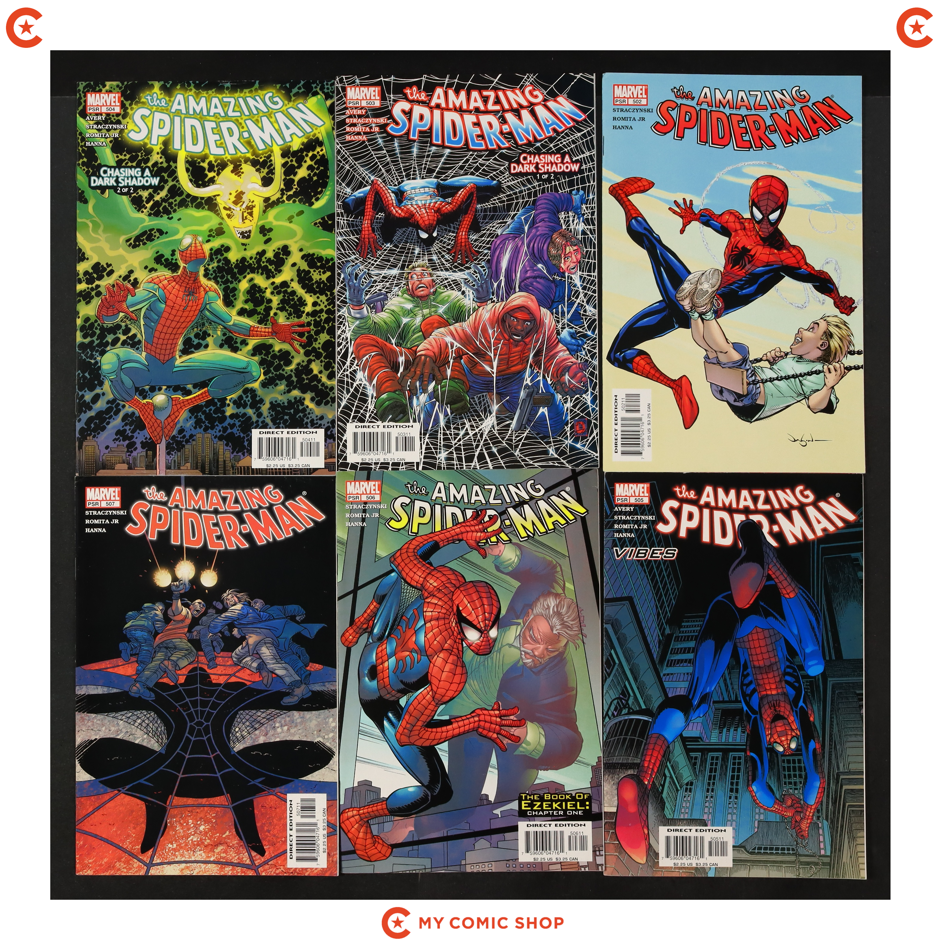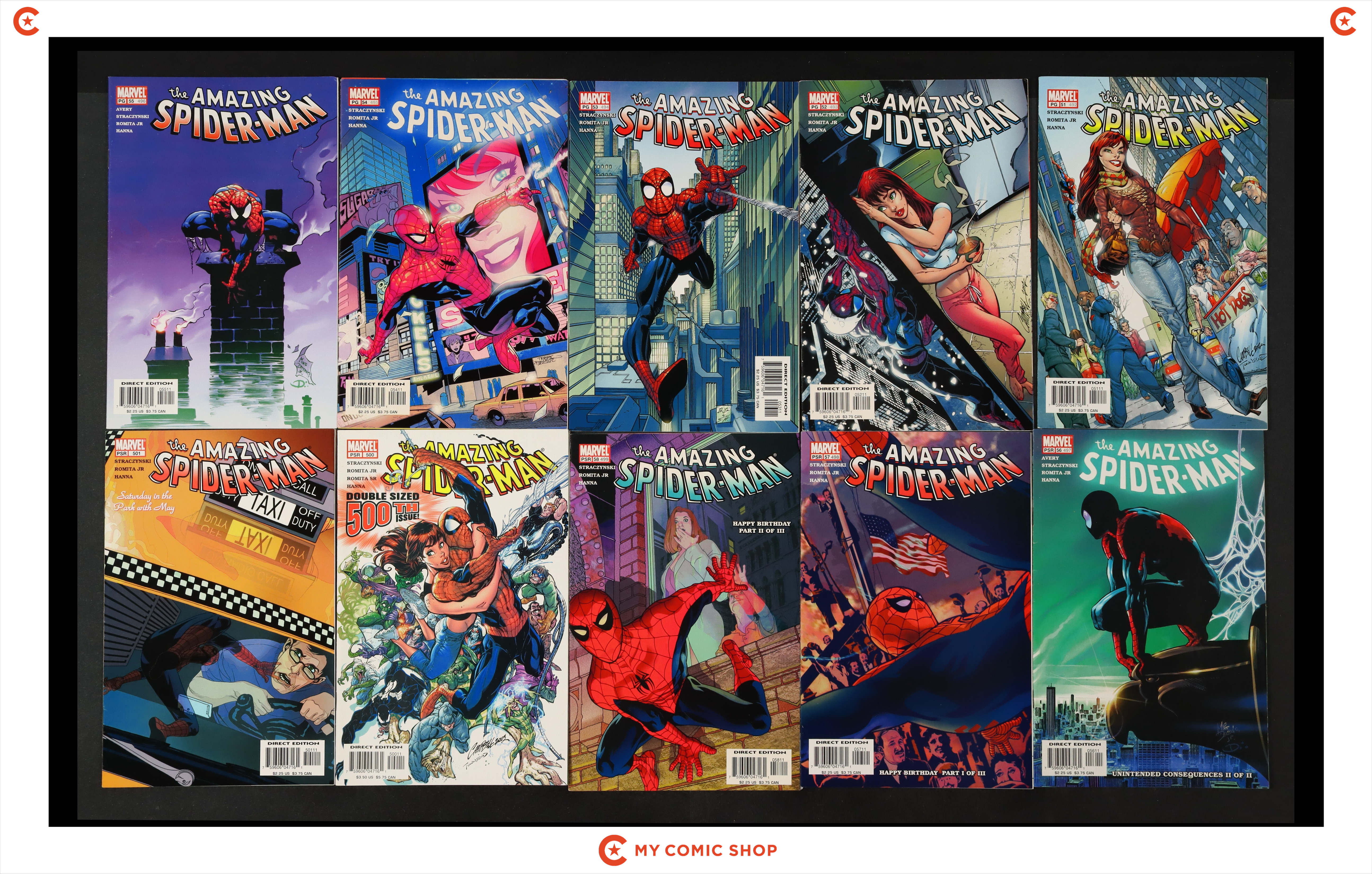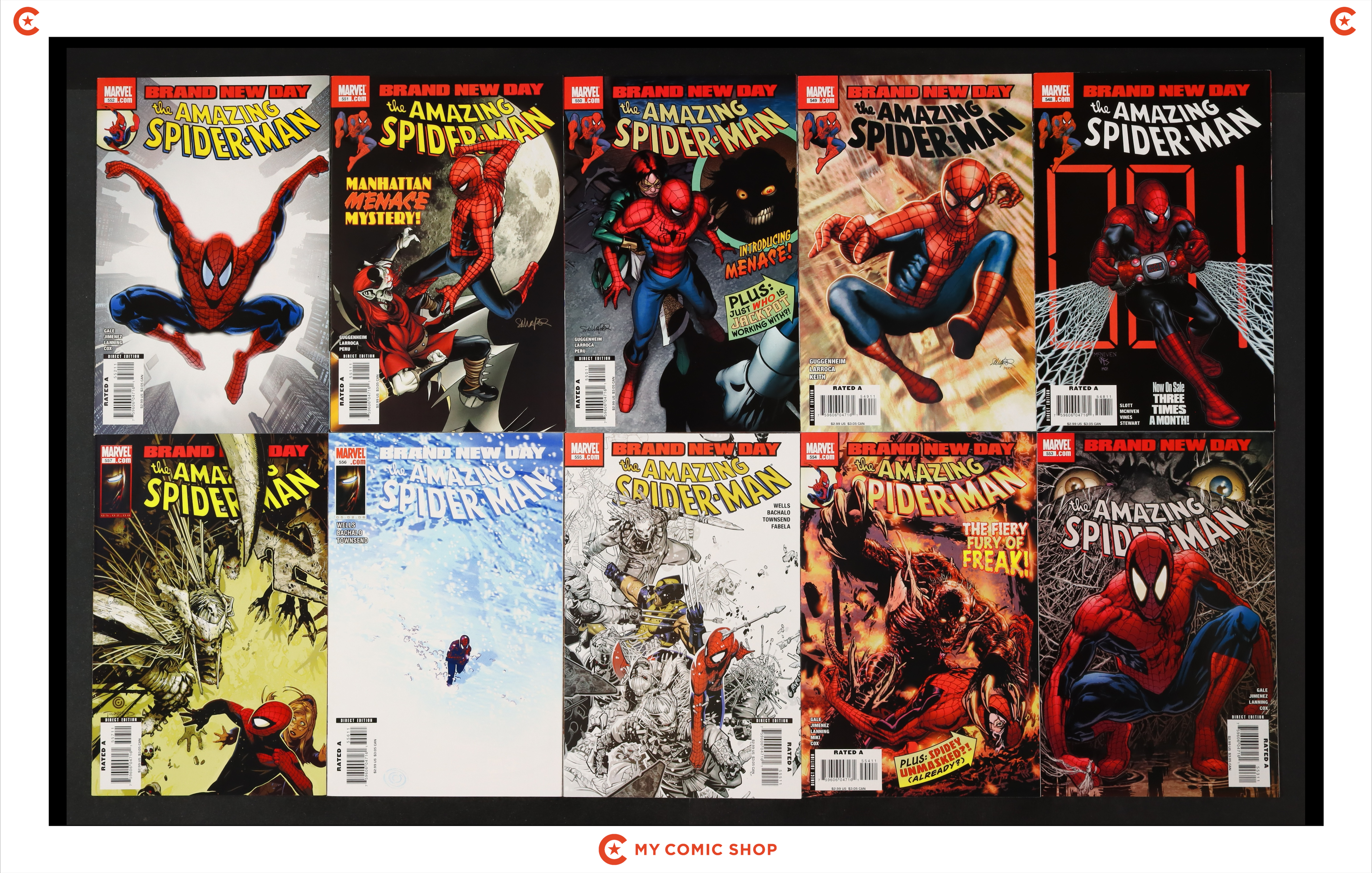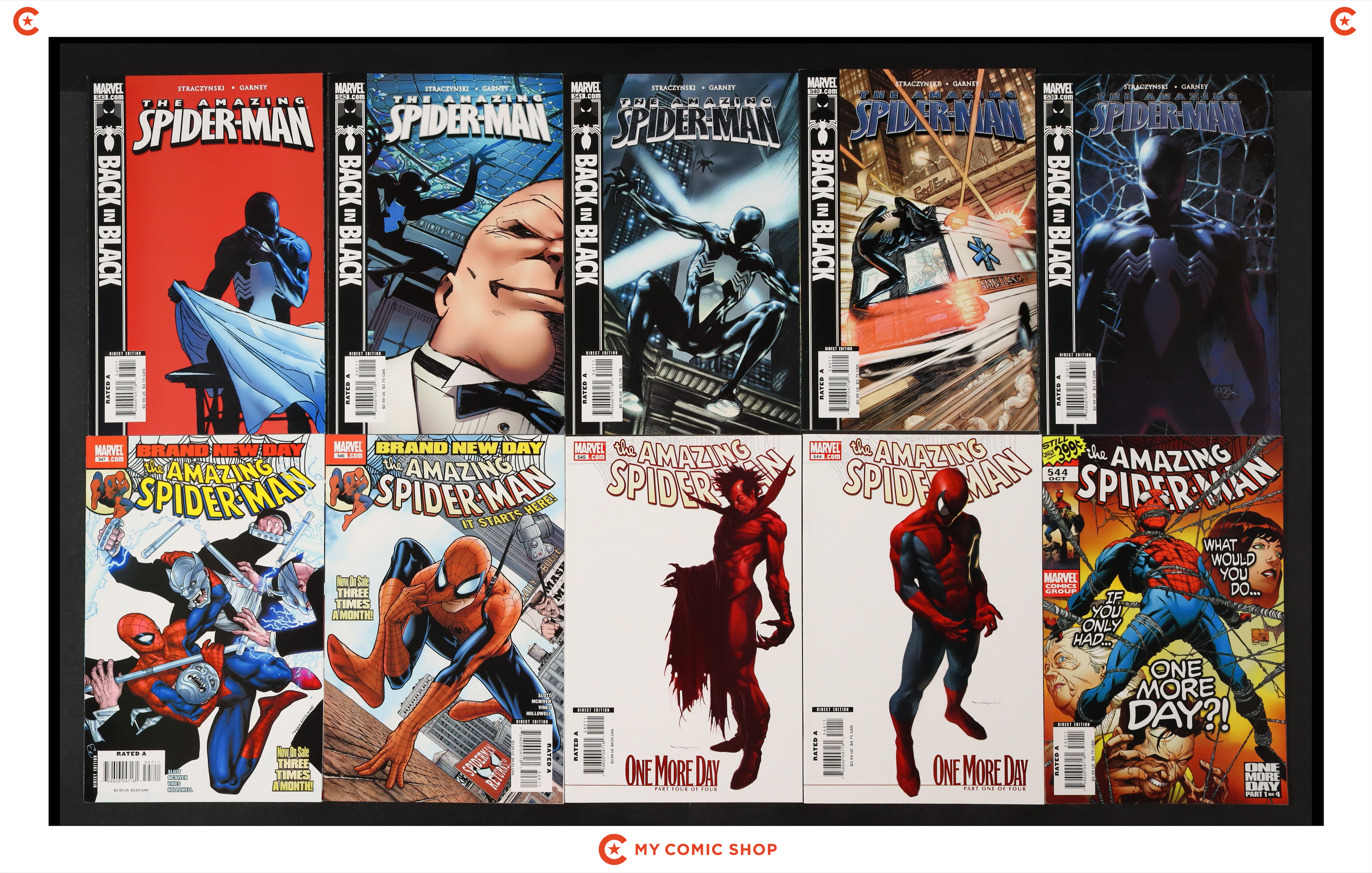 Issues 539A, 540-543, 544A, 544B, 545B, 546A, 547, 548, 549A, 550, 551, 552A, 553, 554, 555A, 556, and 557 of Amazing Spider-Man (1998 2nd Series). Most will grade in the VF to FN range.