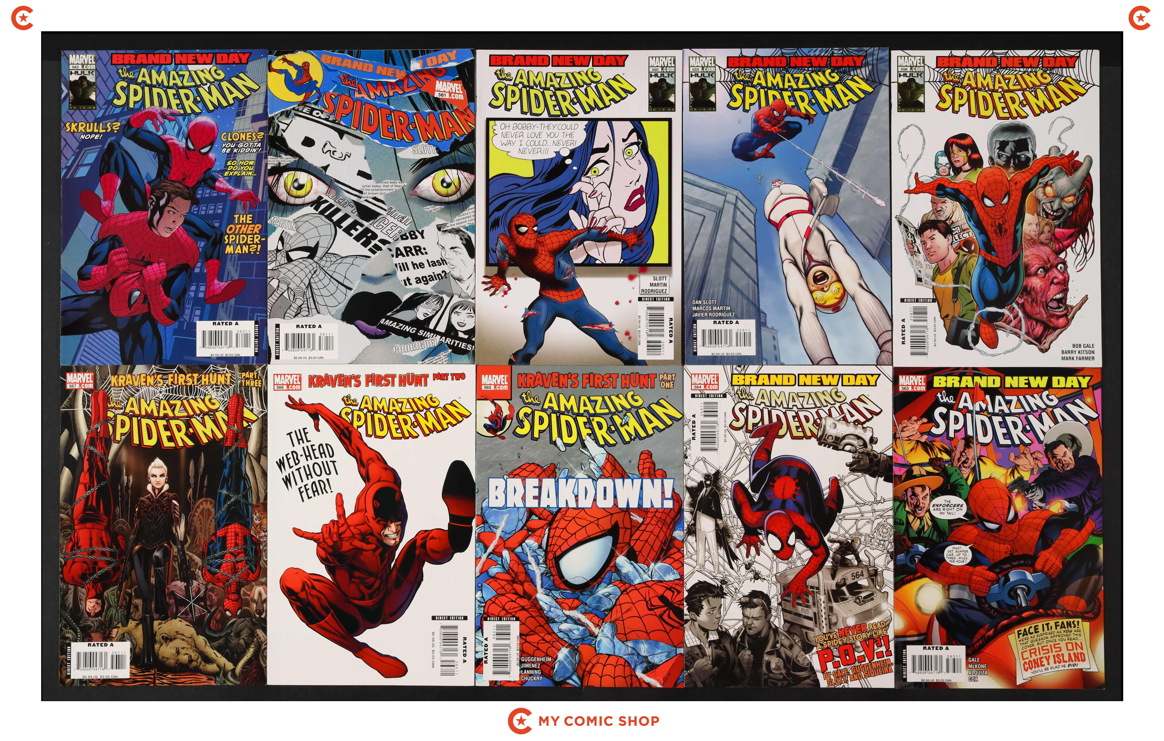 Issues 558-567, 568A-570A, 572A, 572B, 573A, 574-576, and 577A of Amazing Spider-Man (1998 2nd Series). Most will grade in the VF to FN range with #561 grading VG.