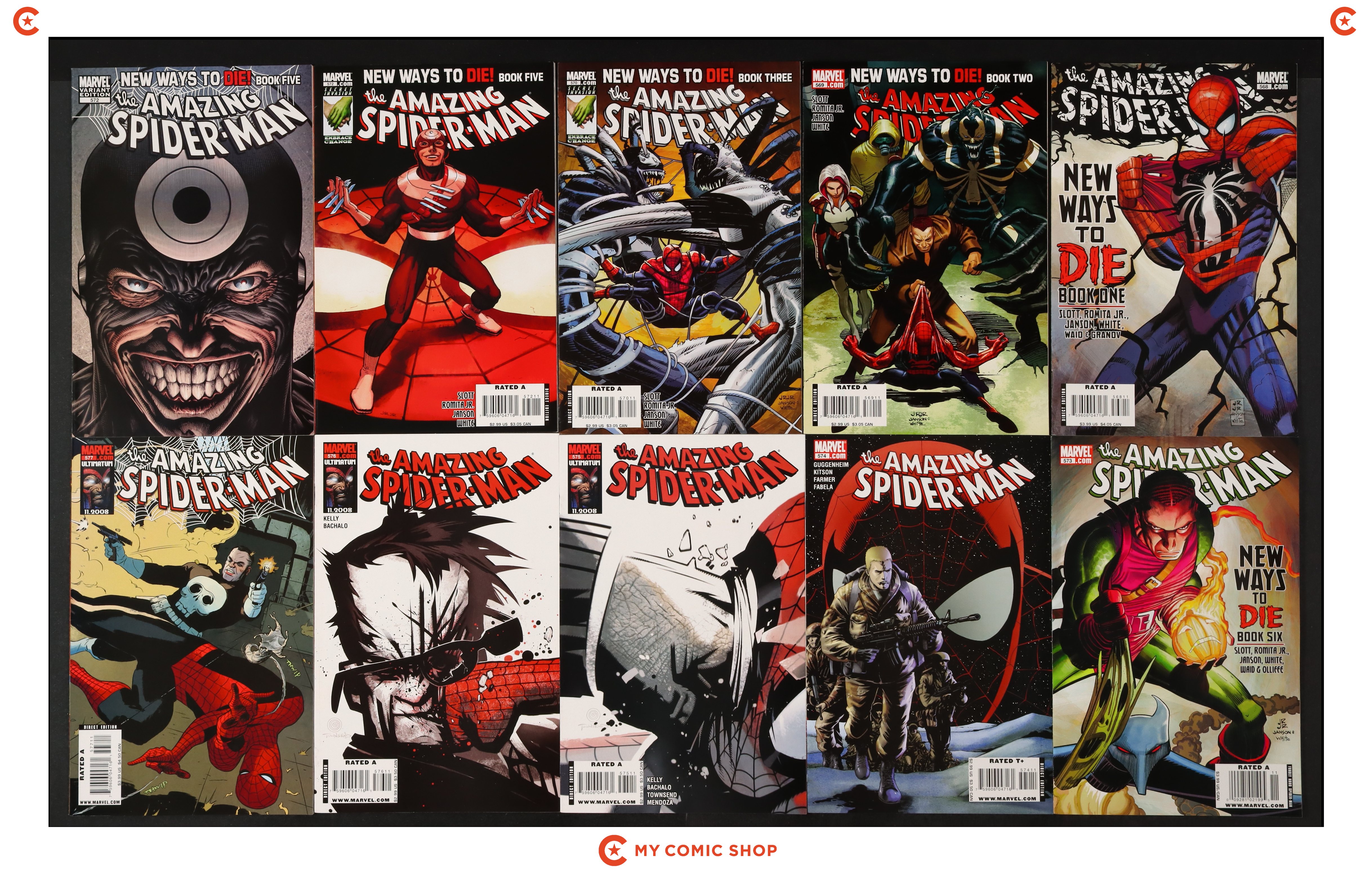 Issues 568A, 569B, 570A, 570B, 571A, 572A, 573A, 573B, and 573C of Amazing Spider-Man (1998 2nd Series). Most will grade in the VF to FN range with #569 grading VG.