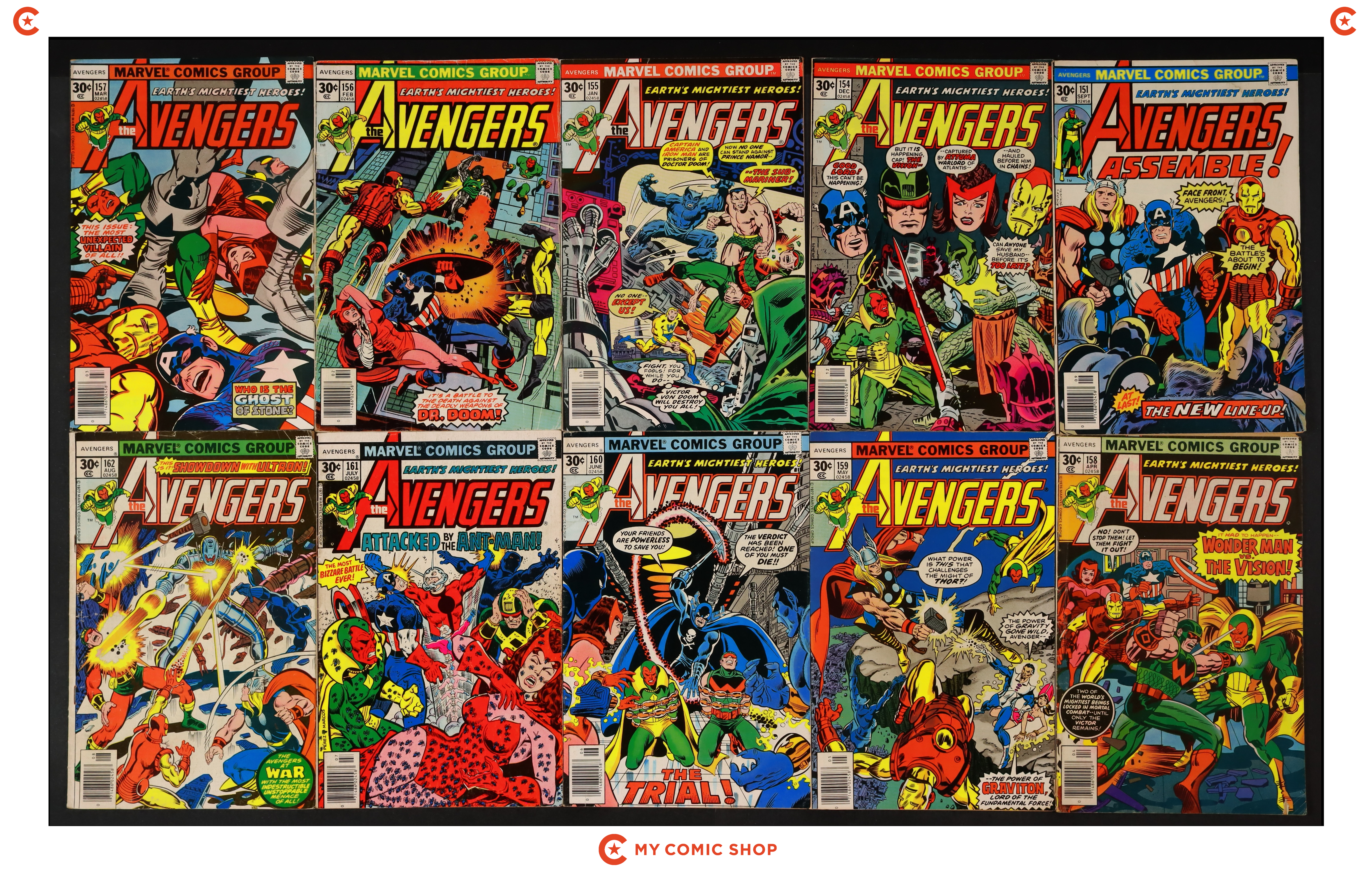 Issues 151, 154-162 of Avengers (1963 1st Series). Most will grade in the GD to VG range with #159 grading FN. #156 has heavy color touch present.