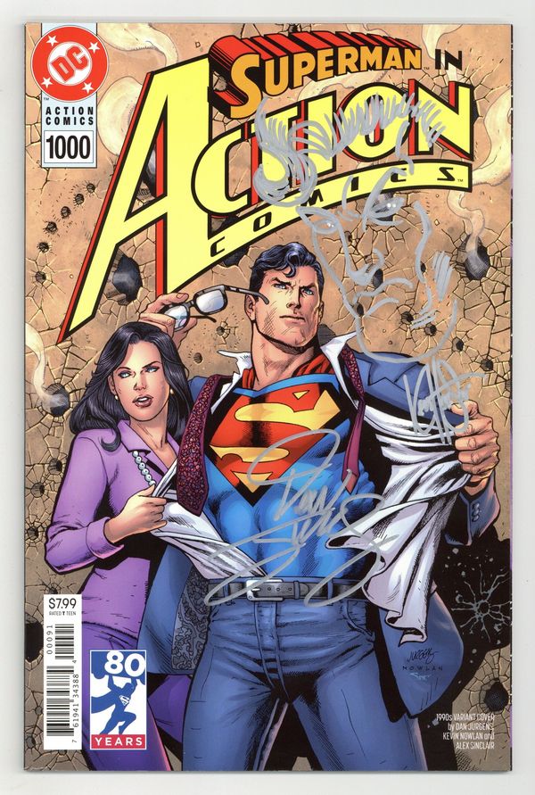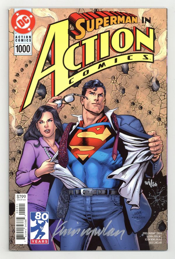 Starts Apr 20 Dynamic Forces edition - Signed by Kevin Nowlan - Limited to 50 copies. Includes certificate of authenticity. Cover by Dan Jurgens and Kevin Nowlan. Written by Dan Jurgens, Peter J. Tomasi, Marv Wolfman, Geoff Johns, Richard Donner, Scott Snyder, Tom King, Louise Simonson, Paul Dini, Brad Meltzer and Brian Michael Bendis. Art by Dan Jurgens, Norm Rapmund, Patrick Gleason, Curt Swan, Butch Guice, Kurt Schaffenberger, Olivier Coipel, Rafael Albuquerque, Clay Mann, Jerry Ordway, José Luis García-López, Kevin Nowlan, John Cassaday, Jim Lee and Scott Williams. Celebrate 1000 issues of Action Comics with an all-star lineup of top talent as they pay tribute to the comic that started it all! From today's explosive action to a previously unpublished tale illustrated by the legendary Curt Swan to the Man of Tomorrow's future, this very special, oversized issue presents the best of the best in Superman stories! Featuring: "From the City That Has Everything" by Dan Jurgens and Norm Rapmund; "Never-Ending Battle" by Peter J. Tomasi and Patrick Gleason; "An Enemy Within" by Marv Wolfman, Curt Swan, Butch Guice and Kurt Schaffenberger (note: original story by Cindy Goff, Swan and Guice, with the final page courtesy of Superman The Secret Years (1985) #2 by Bob Rozakis, Swan and Schaffenberger); "The Car" by Geoff Johns, Richard Donner and Olivier Coipel; "The Fifth Season" by Scott Snyder and Rafael Albuquerque; "Of Tomorrow" by Tom King and Clay Mann; "Five Minutes" by Louise Simonson and Jerry Ordway; "Actionland!" by Paul Dini, José Luis García-López and Kevin Nowlan; "Faster Than a Speeding Bullet" by Brad Meltzer and John Cassaday; and "The Truth" by Brian Michael Bendis, Jim Lee and Scott Williams. Plus: Pin-ups by John Romita, Jr. and Danny Miki, Walter Simonson, and Jorge Jimenez. Softcover, 80 pages, full color. Rated T Cover price $7.99.