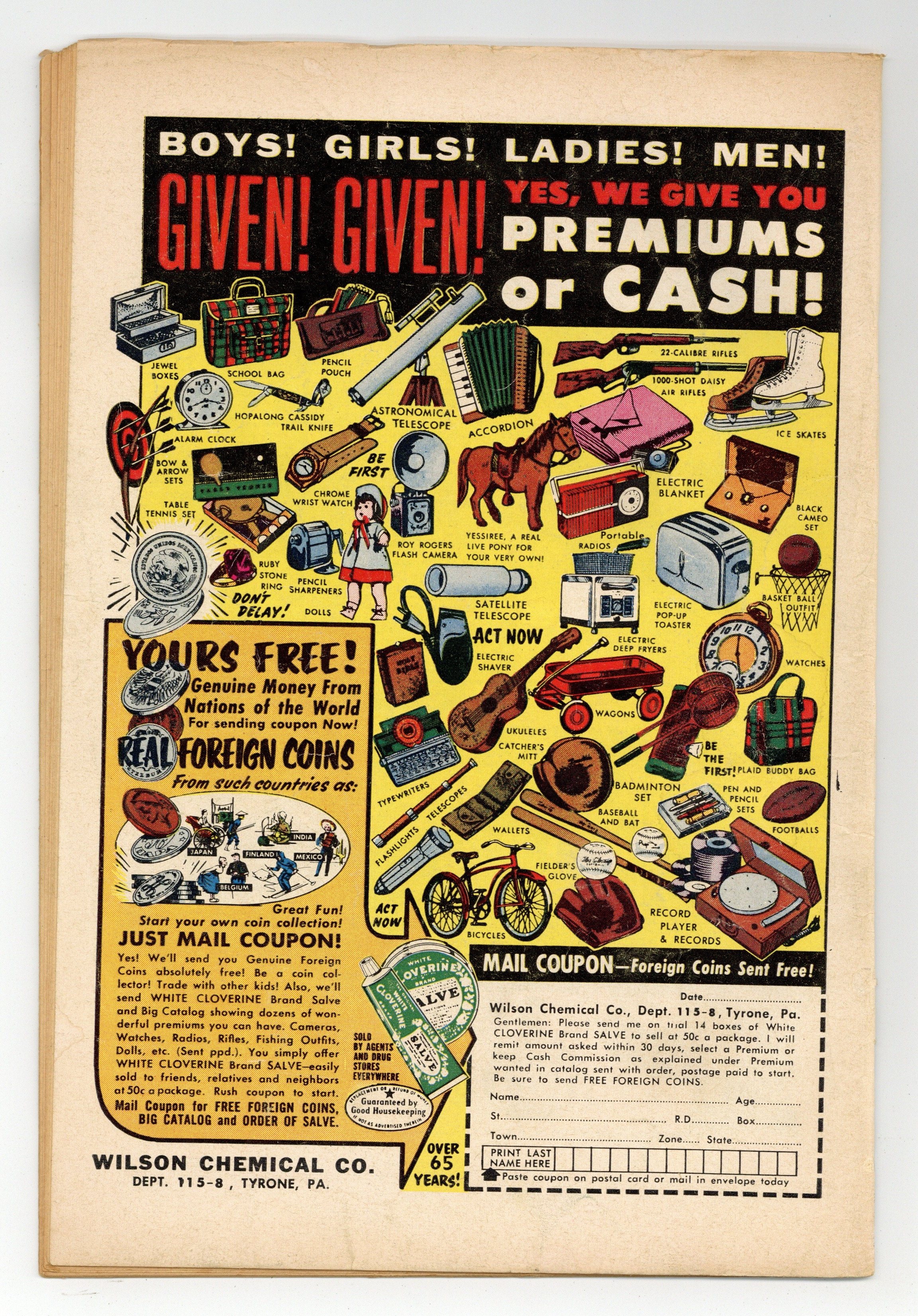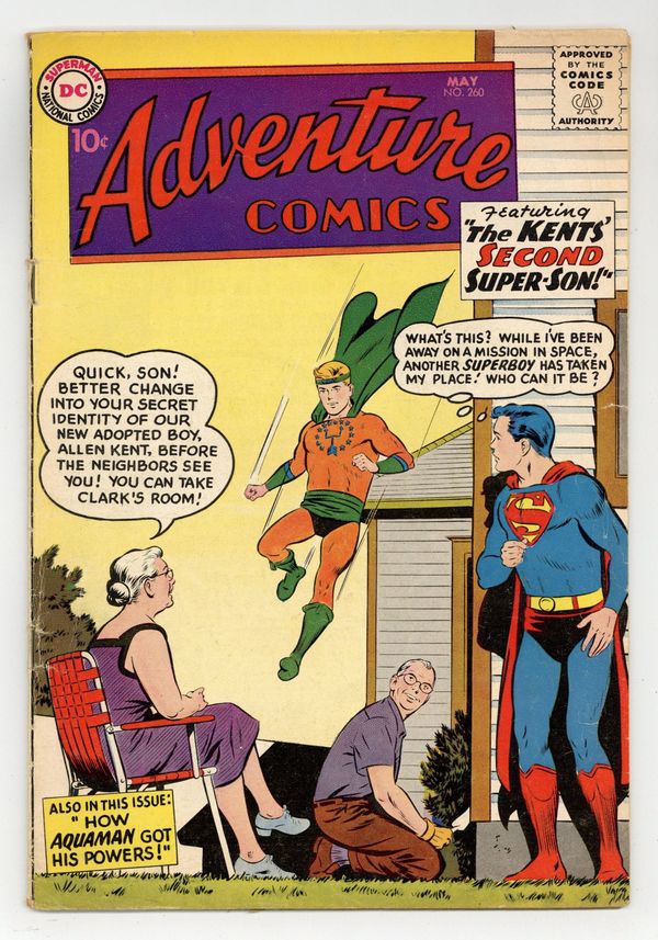 Starts Apr 20 Cover pencils by Curt Swan, inks by Stan Kaye. The Kents' Second Super-Son, script by Jerry Coleman, art by John Sikela; Vidal, a Superboy from another planet, takes Superboy's place on Earth while he's away on a space mission. Peg humor page by Henry Boltinoff. How Aquaman Got His Powers!, script by Robert Bernstein, art by Ramona Fradon; Aquaman stops the U.S. Navy from testing atomic depth charges and recounts his origin to Commander Haskel. Little Pete humor page by Henry Boltinoff. Green Arrow's New Partner!, script by Robert Bernstein, art by Lee Elias. 36 pages, Full Color. Cover price $0.10.
