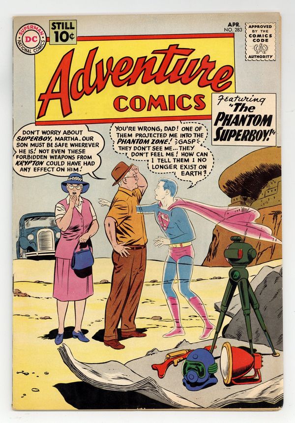 Starts Apr 4 Cover pencils by Curt Swan, inks by Stan Kaye. 1st appearance of the Phantom Zone in The Phantom Superboy, script by Robert Bernstein, art by George Papp; After Professor Lang finds a box of Kryptonian weapons, Superboy is accidentally projected into the Phantom Zone, the place where Kryptonian criminals were exiled. A Salute to Our American Indians public service announcement, script by Jack Schiff, art by Bernard Baily. The Lion with the Double Identity starring Congorilla, script by Robert Bernstein, art by Howard Sherman. Little Pete humor page by Henry Boltinoff. 36 pages, Full Color. Cover price $0.10.