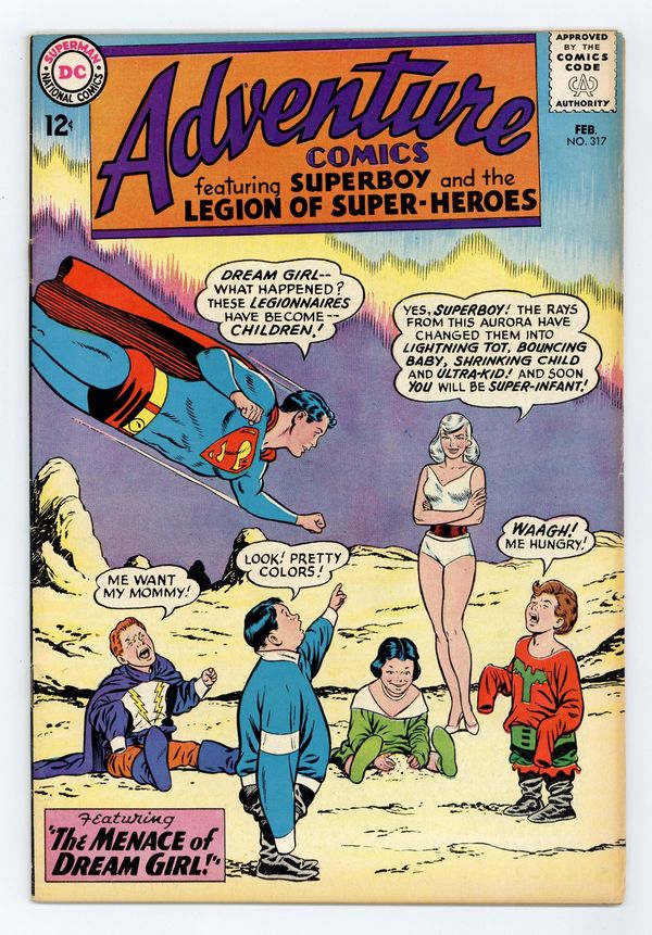 Starts Apr 4 Cover pencils by Curt Swan, inks by George Klein. Part I: The Menace of Dream Girl!--Tales of the Legion of Super-Heroes, script by Edmond Hamilton, art by John Forte; Dream Girl joins the Legion and insists Lightning Lass be expelled when she loses her powers and demands Triplicate Girl be court-martialed for accusing her of causing Lightning Lass to lose her power. Super-Turtle humor page by Henry Boltinoff. Part II: The Doom of the Legion!--Tales of the Legion of Super-Heroes, script by Edmond Hamilton, art by John Forte; Even more Legionnaires are expelled before Dream Girl reveals to Star Boy that it was all a plot to prevent their deaths. In this two-parter, Lightning Lass becomes Light Lass, and the Hall of Fame series begins.The Shrinking of Superboy, art by John Sikela. 36 pages, Full Color. Cover price $0.12.