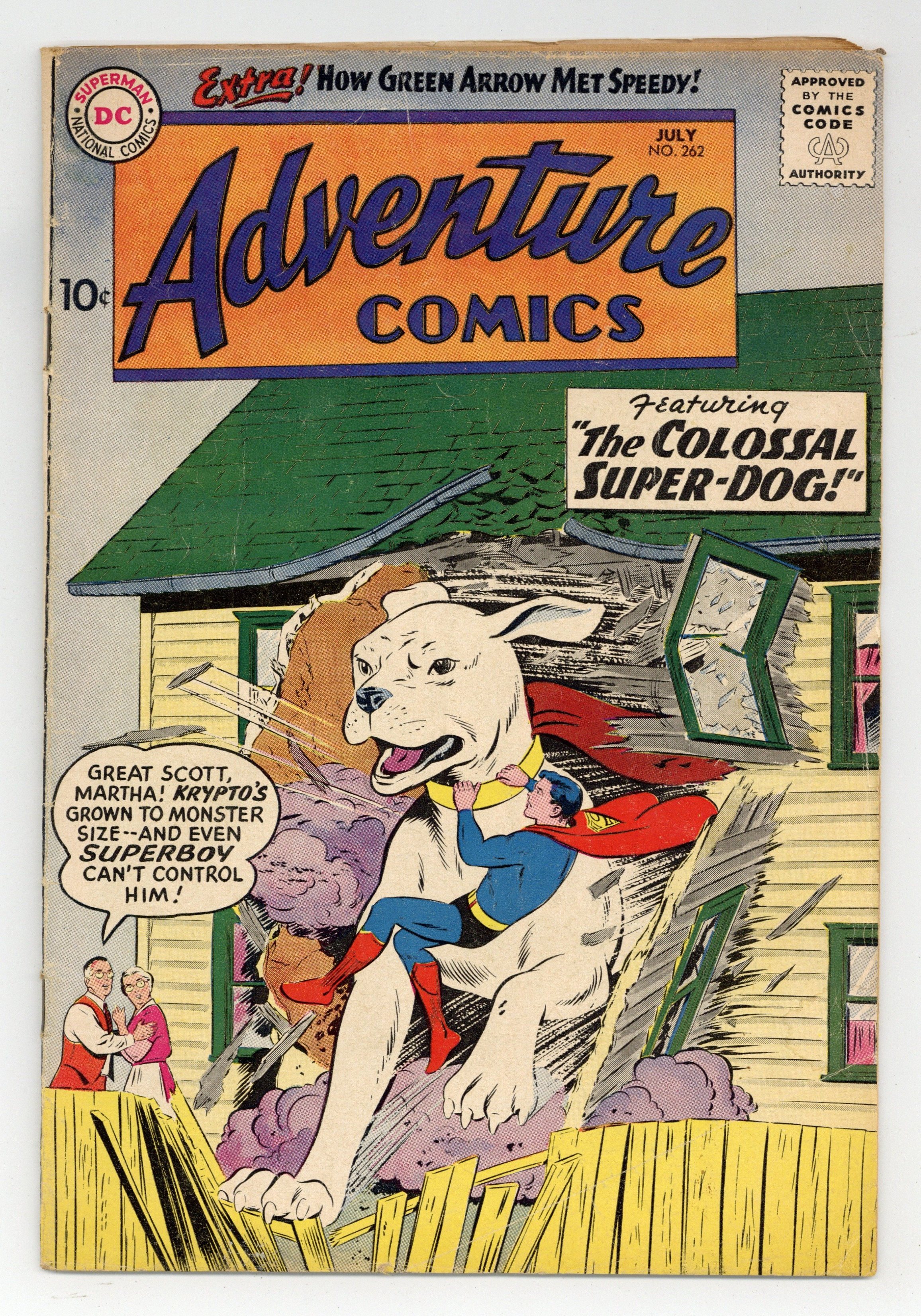 Starts Apr 20 Cover pencils by Curt Swan, inks by Stan Kaye. The Colossal Superdog, script by Otto Binder, art by George Papp; A glowing purple meteor turns Krypto into a colossal superdog. The Undersea Hospital!, art by Ramona Fradon; Aquaman opens an undersea hospital to help his undersea friends. The World's Worst Archer!, script by Robert Bernstein, art by Lee Elias; Chief Brave Bow helps Roy Harper become Green Arrow's new partner. 36 pages, Full Color. Cover price $0.10.