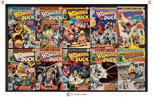 Issues 5-8, 10, 27, 28, and 30 of Howard the Duck (1976 1st Series); and 1 of Howard the Duck (1976 1st Series) Annual. Most will grade in the FN range with a few grading VF.