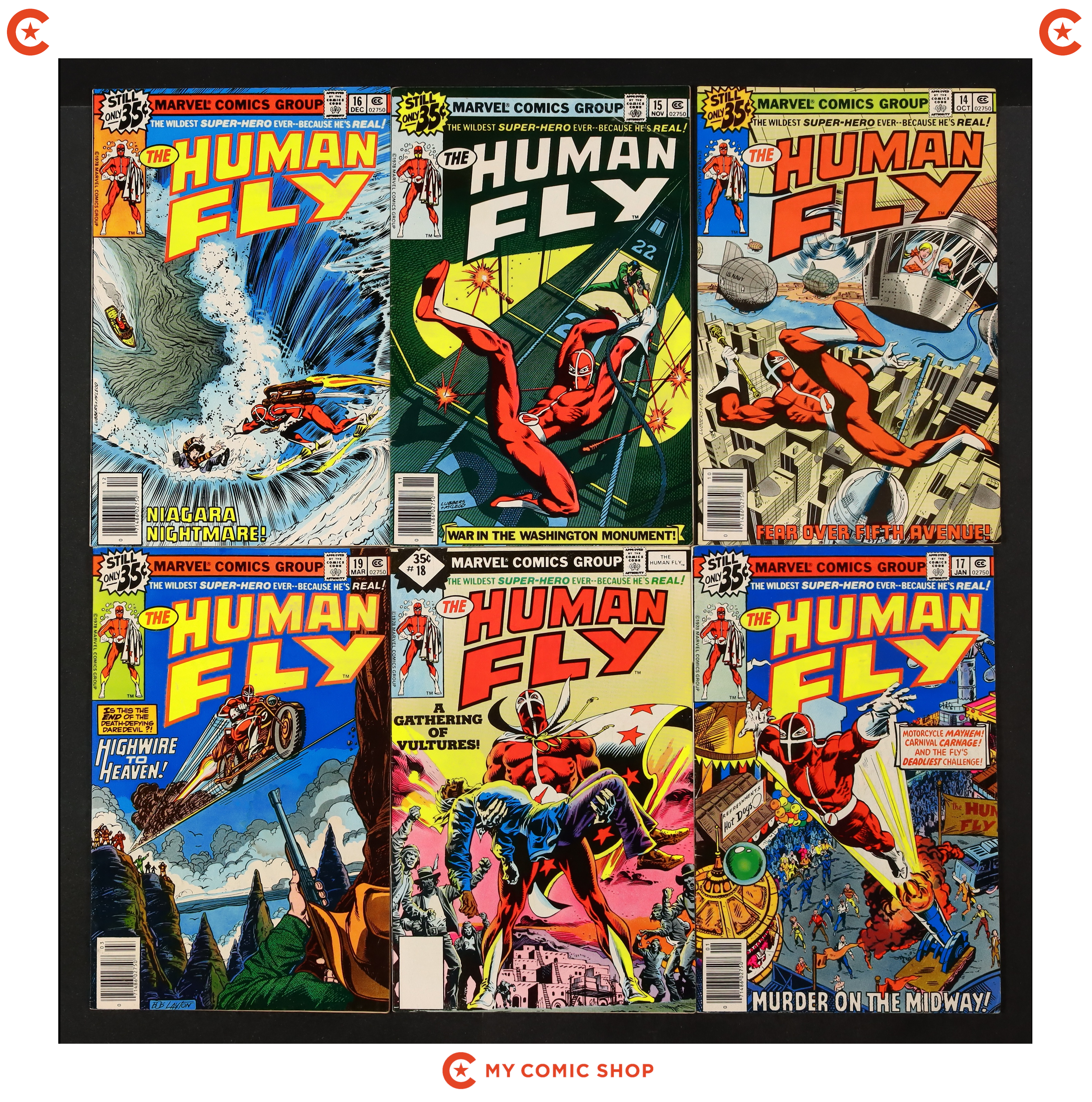 Issues 1-7, 10, 11, 13-17, and 19 of Human Fly (1977 Marvel); and 18 of Human Fly (1977) Whitman Variants. Most will grade in the FN to VG range.