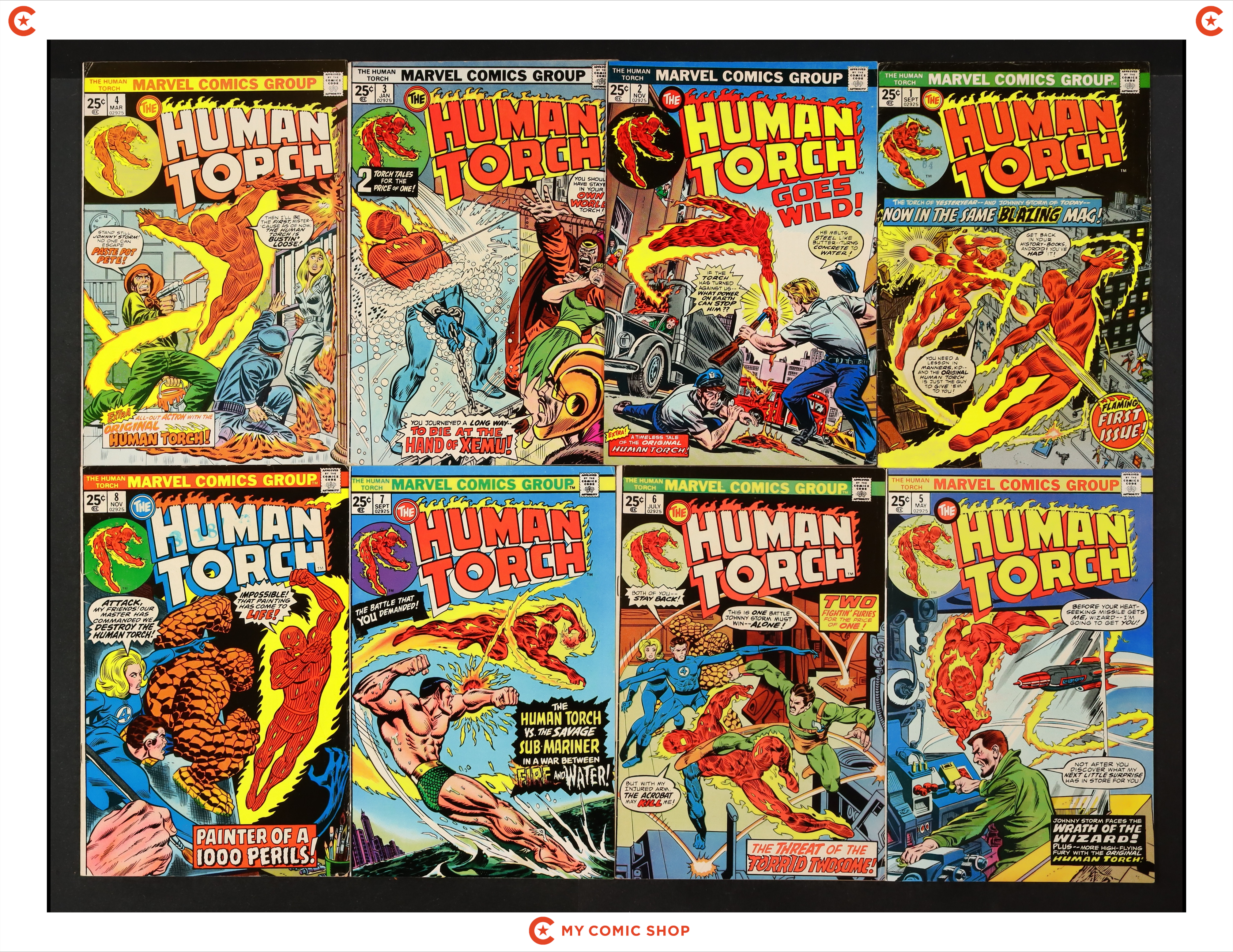 Issues 1-8 of Human Torch (1974 1st Series). Most will grade in the FN to VG range.