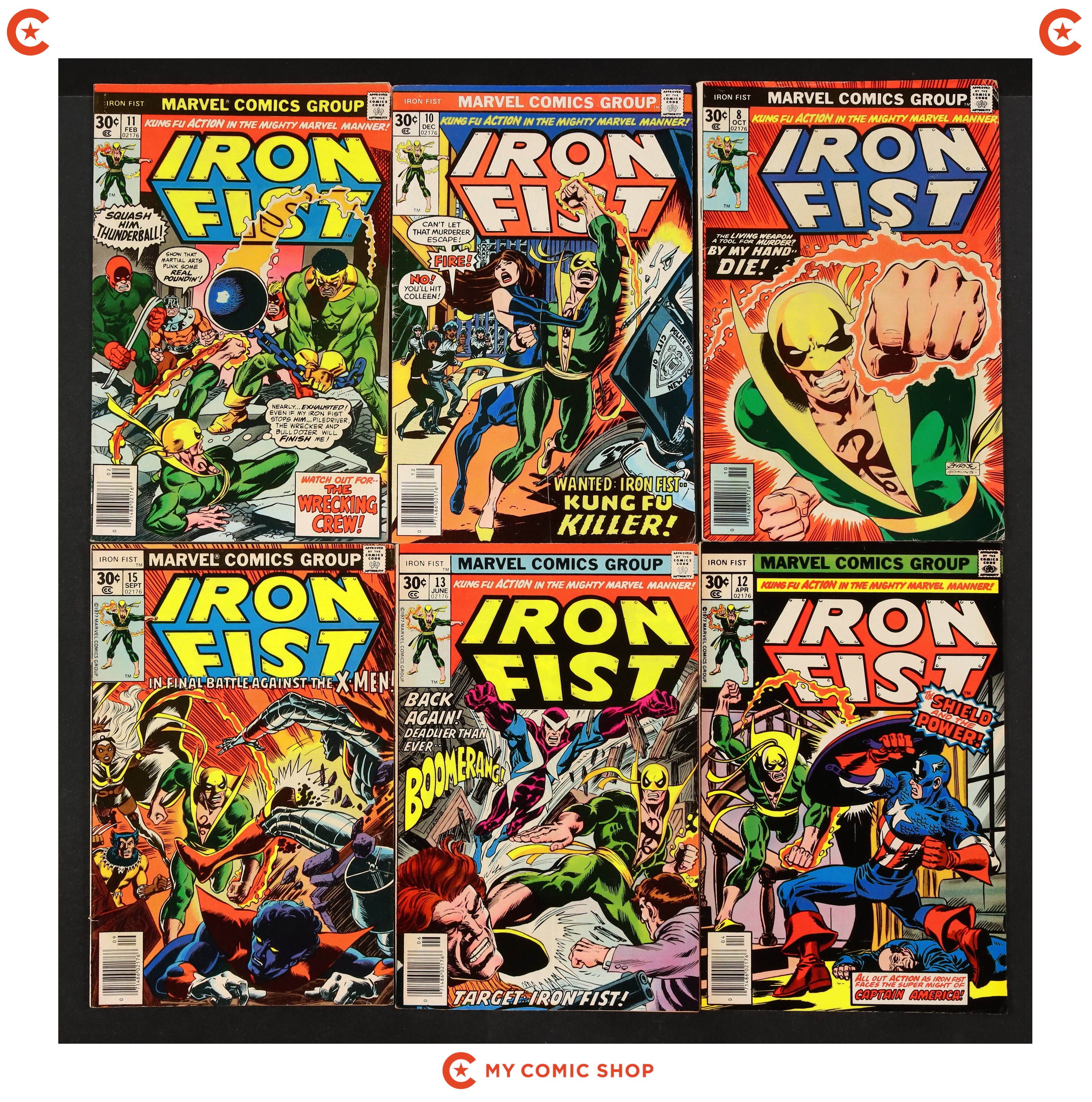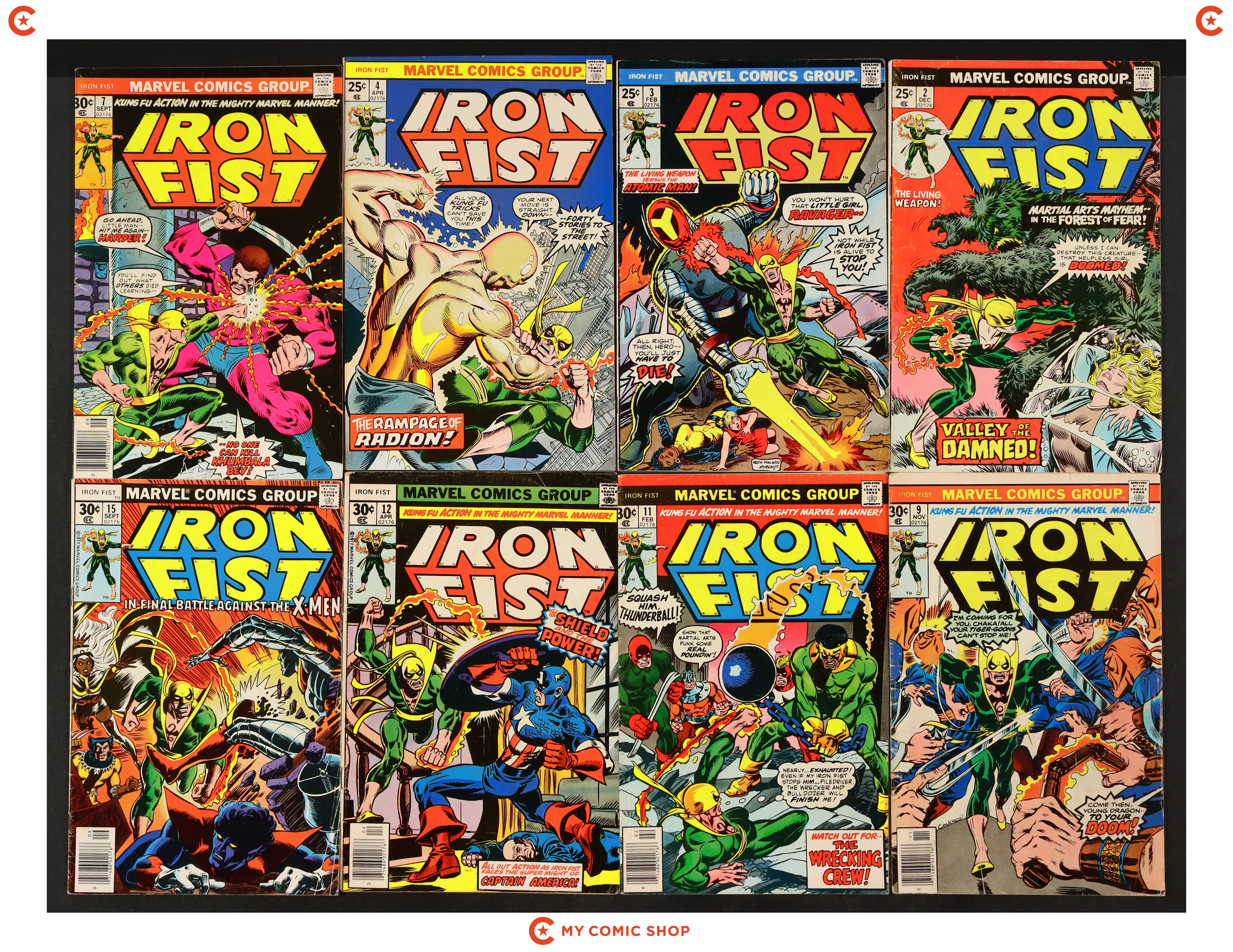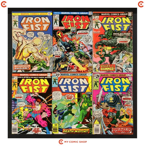 Starts Apr 4 "A Duel of Iron!" Guest-starring Iron Man and Misty Knight. Story by Chris Claremont. Art by John Byrne and Al Williams. Story continued from Marvel Premiere #25. Daniel Rand was reborn in the fires of a dragon's heart in the mystical land of K'un Lun. Now, he is the living weapon known as Iron Fist, finally in his own series. Hot on the trail of Colleen Wing's kidnappers, Iron Fist has come to Stark International seeking answers. Wanted by the police for a murder he did not commit, Danny comes face-to-face with the Invincible Iron Man, and Shell Head is in no mood to give a wanted man the benefit of the doubt. It's the Golden Avenger vs. the Living Weapon. Marvel Value Stamp. Cover price $0.25.