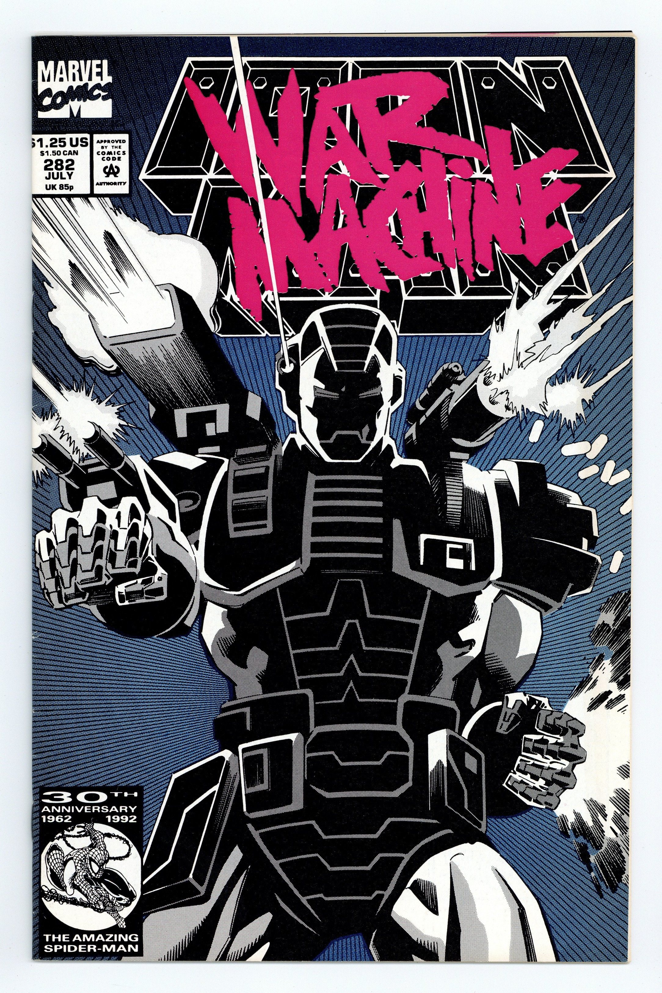 Starts Apr 20 Direct Edition. "War Machine" Part 2 of 3. First (full) appearance of the War Machine armor. Script by Len Kaminski. Pencils by Kevin Hopgood. Inks by Bob Wiacek. Cover by Kevin Hopgood and Bob Wiacek. The Masters of Silence came to Stark Enterprises last issue looking for a fight! And now the trio is getting one in spades thanks to the War Machine armor! In a remarkable display of firepower; Tony Stark, clad in the new gray & white armor, trounces his would-be assassins! In the meantime, Jim Rhodes contacts SHIELD to learn who framed Stark Enterprises for the deadly accident in Japan! And it turns out to be someone the armored avenger knows very, very well! Cameo appearances by Justin Hammer and Nick Fury. (Note: The cover to issue 282 was reprinted as the cover to Iron Man (1968 1st series) Marvel Legends Reprint 281.) 32 pages. Cover price $1.25.