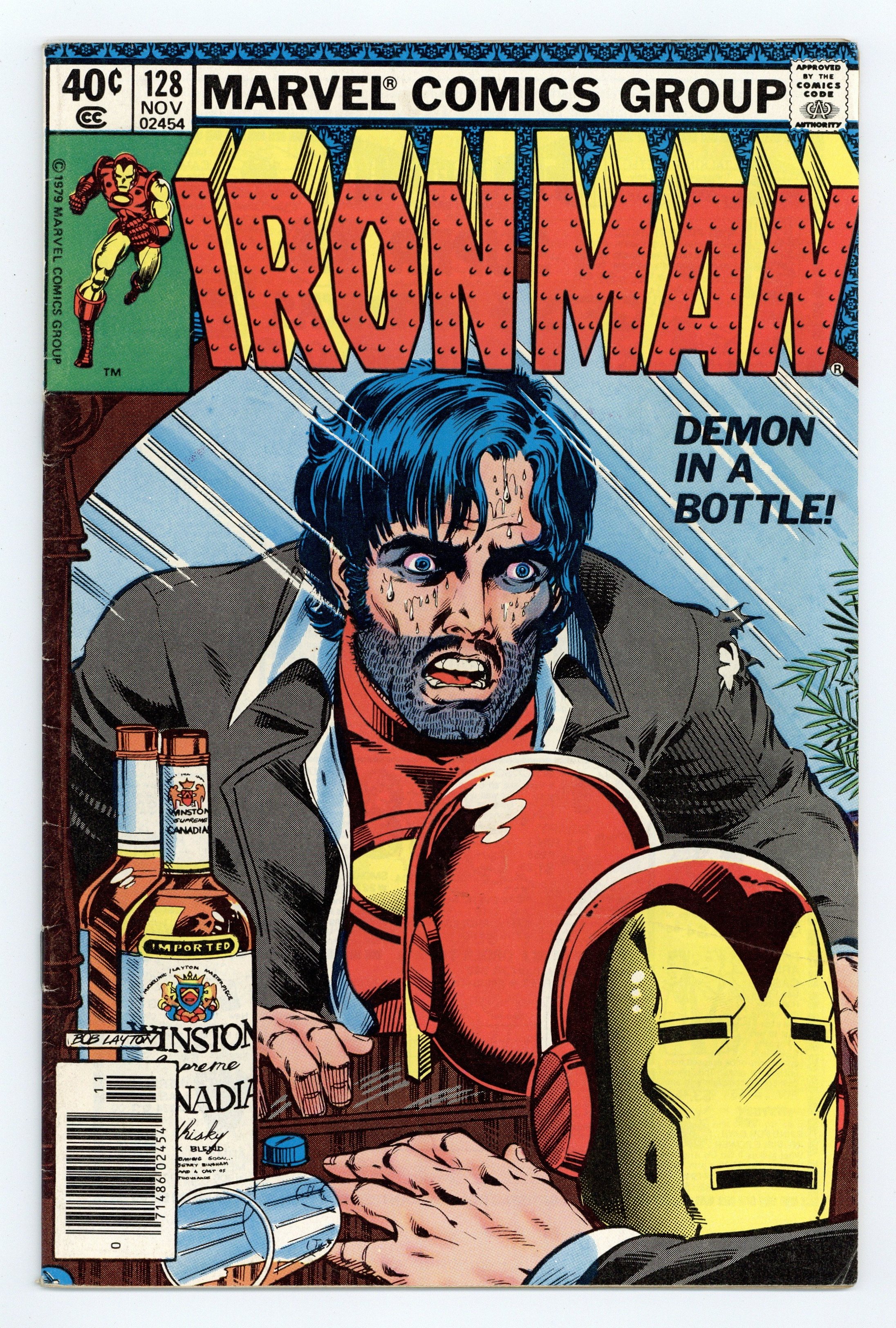 Starts Apr 20 Newsstand Edition. "Demon in a Bottle" Plot by David Michelinie and Bob Layton. Script by David Michelinie. Art by John Romita Jr. (breakdowns) and Bob Layton (finishes). Cover by Bob Layton. One of the most critically acclaimed Iron Man stories, "Demon in a Bottle" explores the flaws of the man behind the helmet. Tony Stark's struggle with alcoholism comes to a head in this pull-no-punches look at his problem. Appearances by Bethany Cabe and Jarvis. (Note: This issue was reprinted in 2006 in the trade paperback: Iron Man Demon in a Bottle; and again in 2008 in the hardcover: Iron Man Demon in a Bottle.) 32 pages. Cover price $0.40.