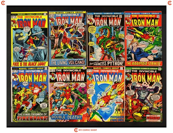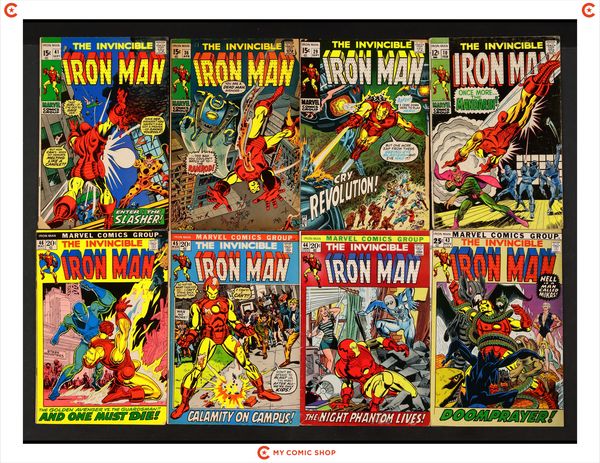 Issues 49, 50, 52, 53, and 56-59 of Iron Man (1968 1st Series). Most will grade in the VG range with a few grading FN.