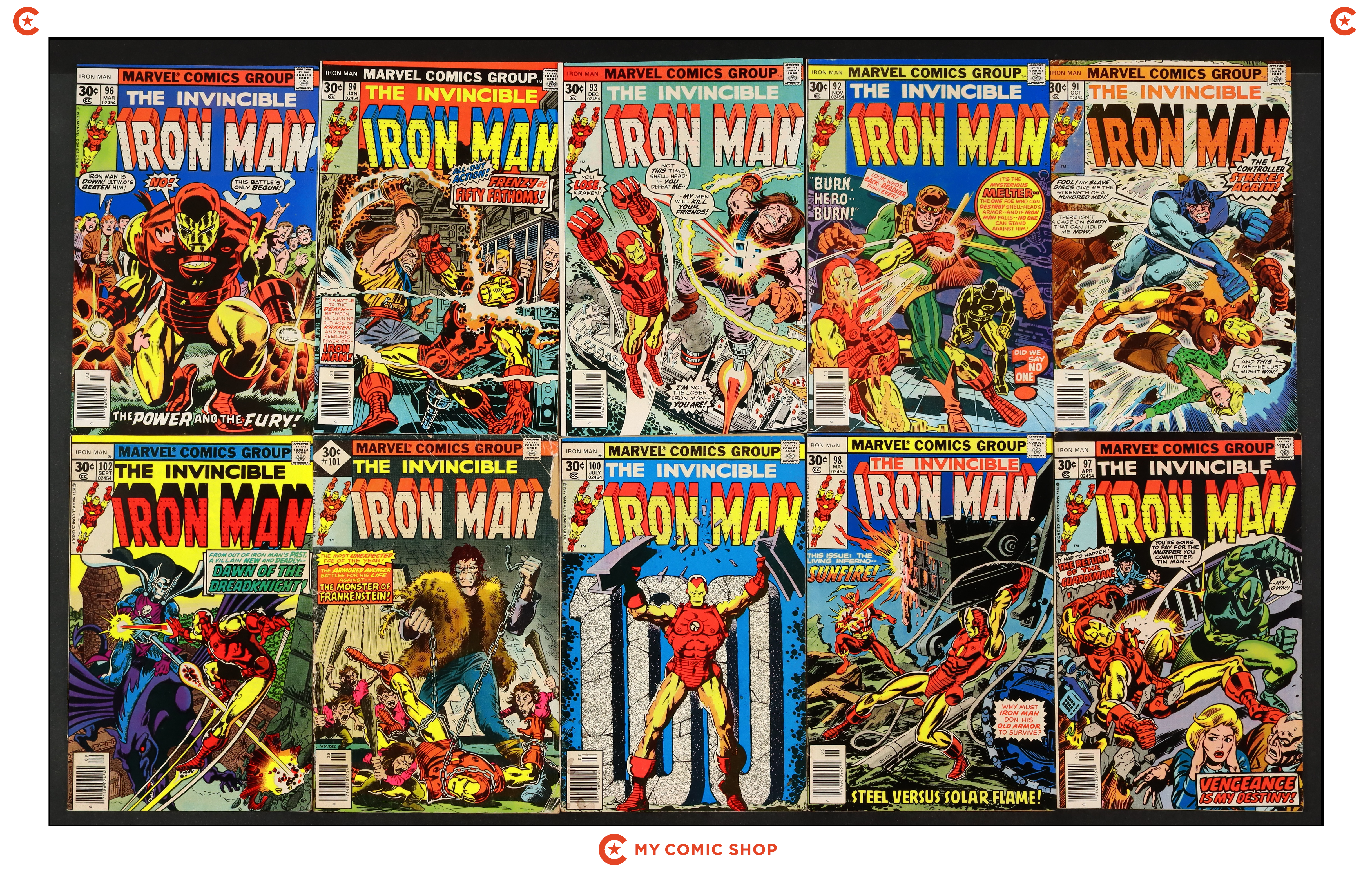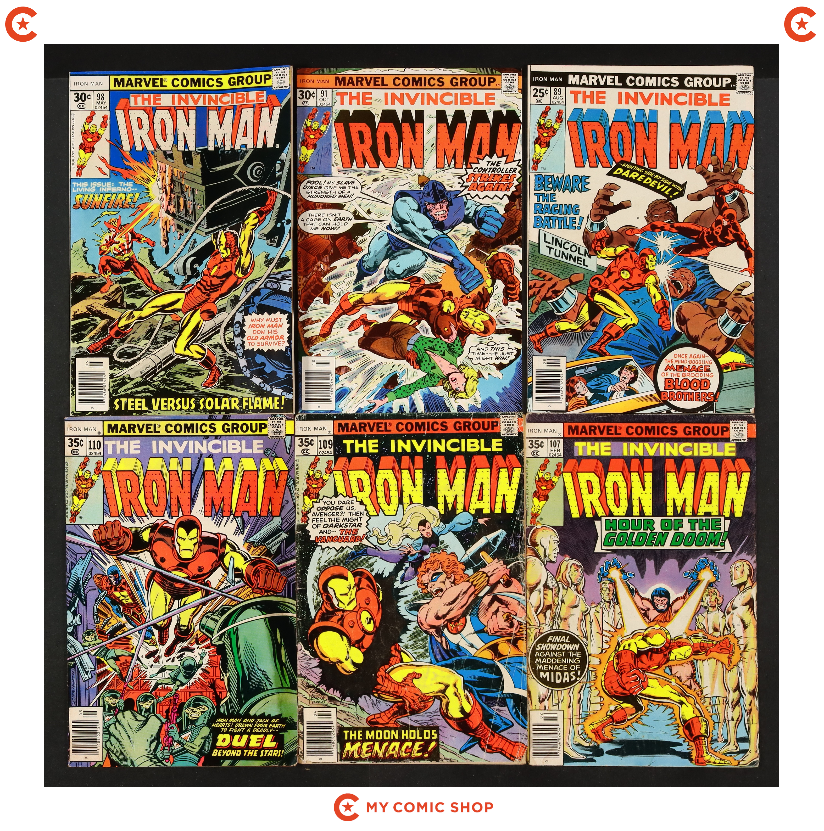 Issues 91-94, 96-98, 100, and 102 of Iron Man (1968 1st Series); and 101 of Iron Man (1968 1st Series) Whitman Variants. Most will grade in the FN to VG range with #100 grading PR (ad page missing, does not affect story or art).