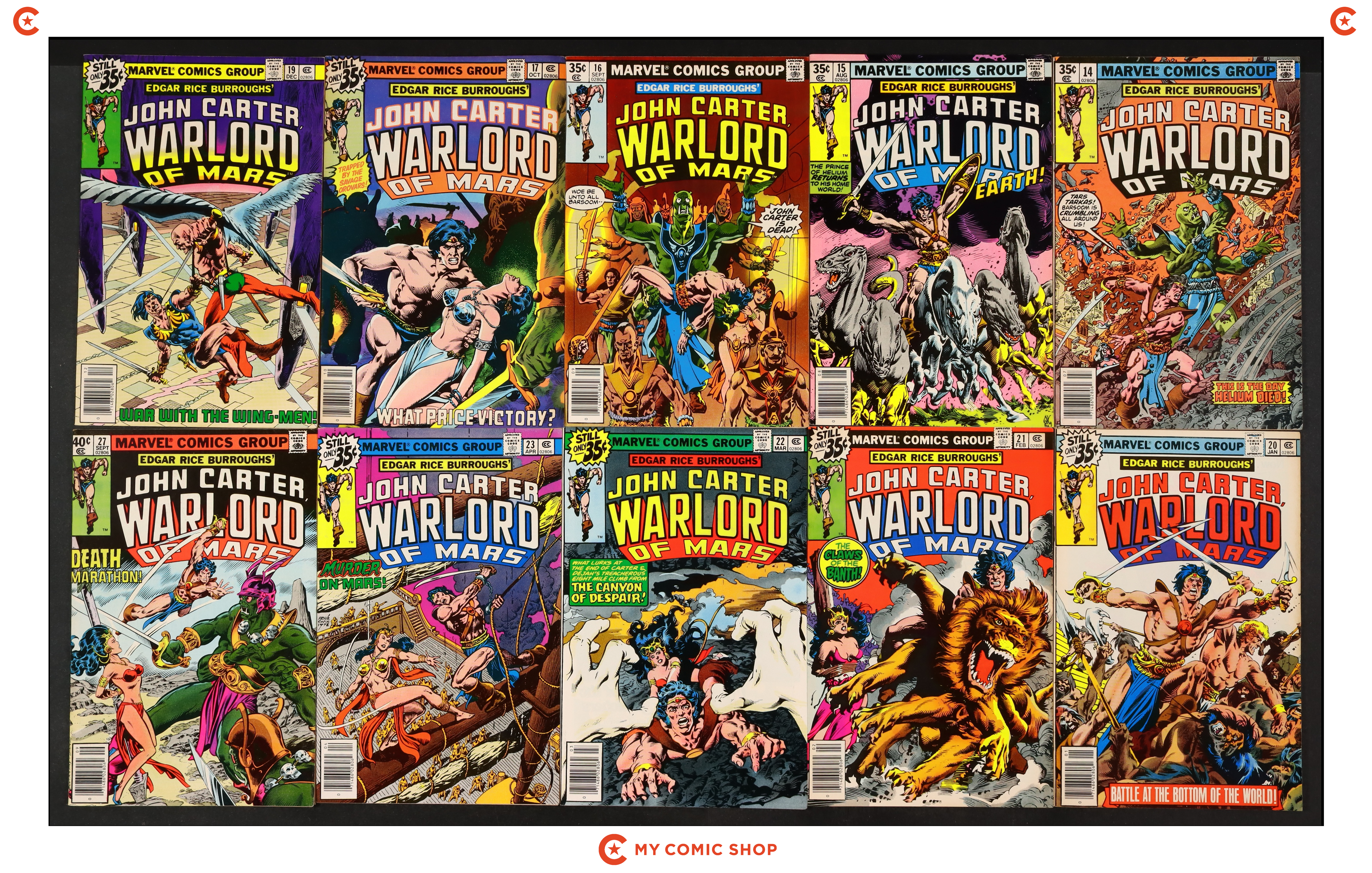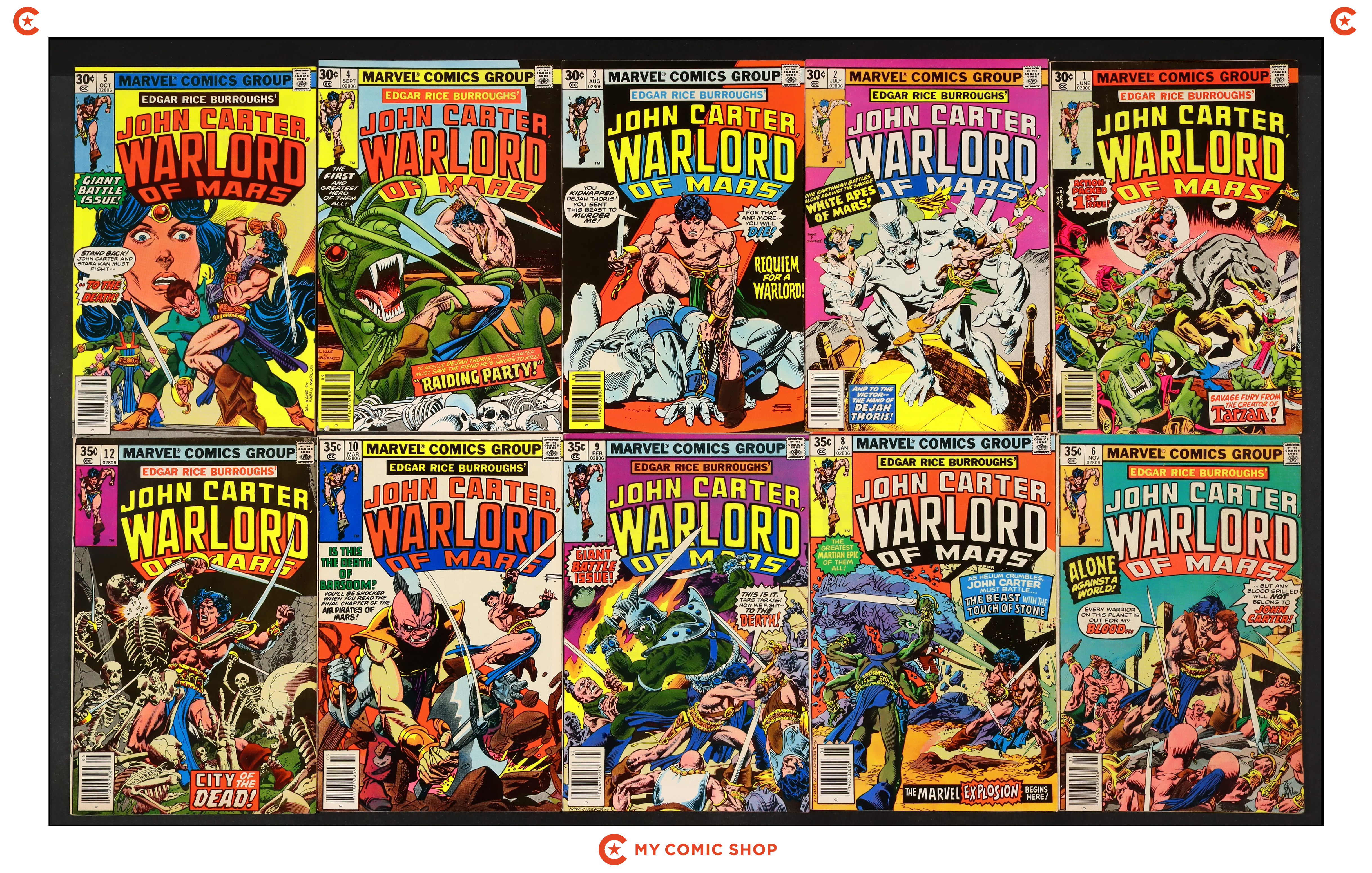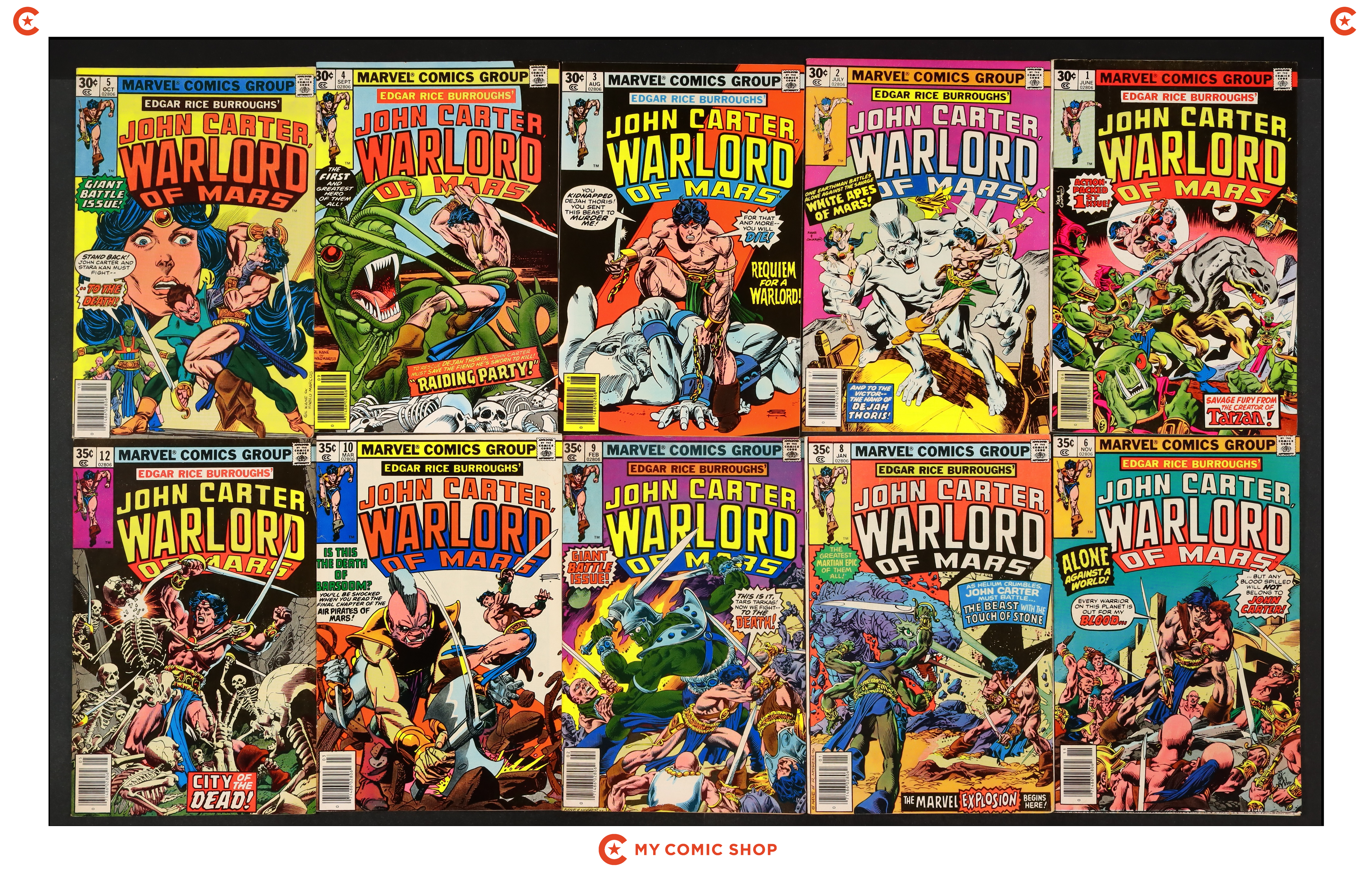 Issues 1-6, 8-10, and 12 of John Carter Warlord of Mars (1977 Marvel). Most will grade in the FN range with a few grading VF and #6 grading VG.