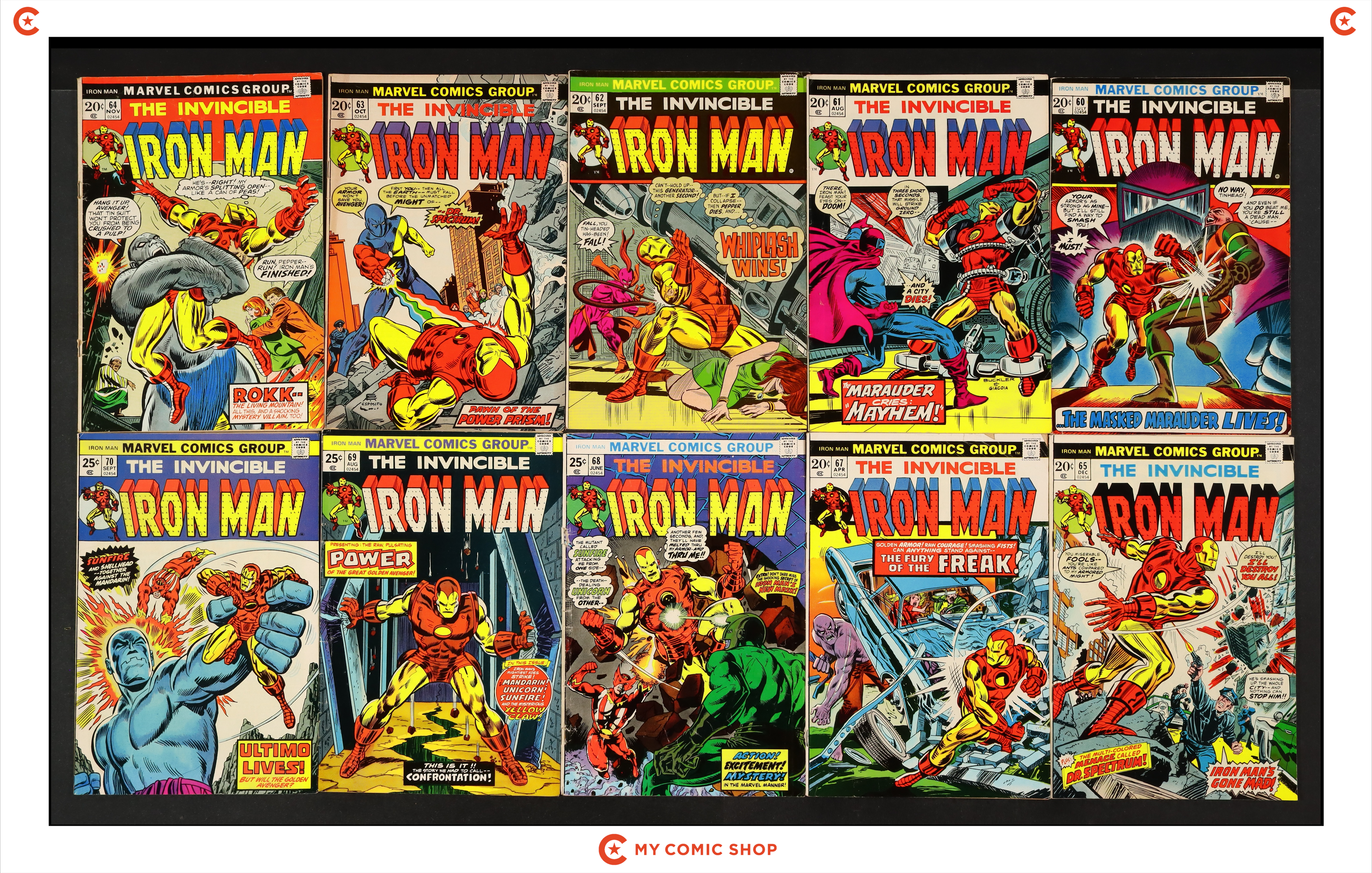 Issues 60-65 and 67-70 of Iron Man (1968 1st Series). Most will grade in the FN to VG range with #67 grading FR (missing Marvel Value Stamp).