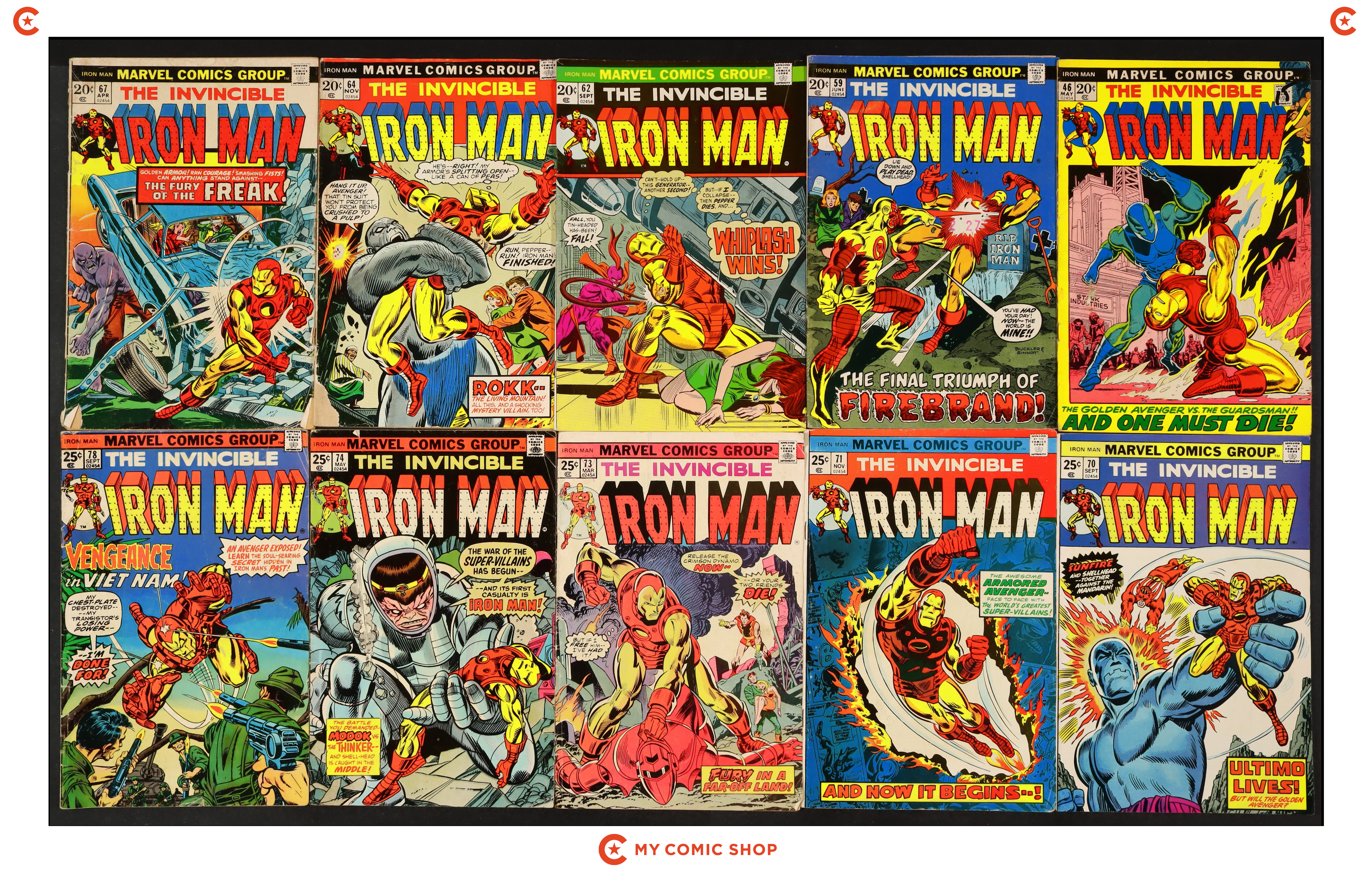 Issues 46, 59, 62, 64, 67, 70, 71, 73, 74, and 78 of Iron Man (1968 1st Series). Most will grade in the VG range with a couple grading GD.