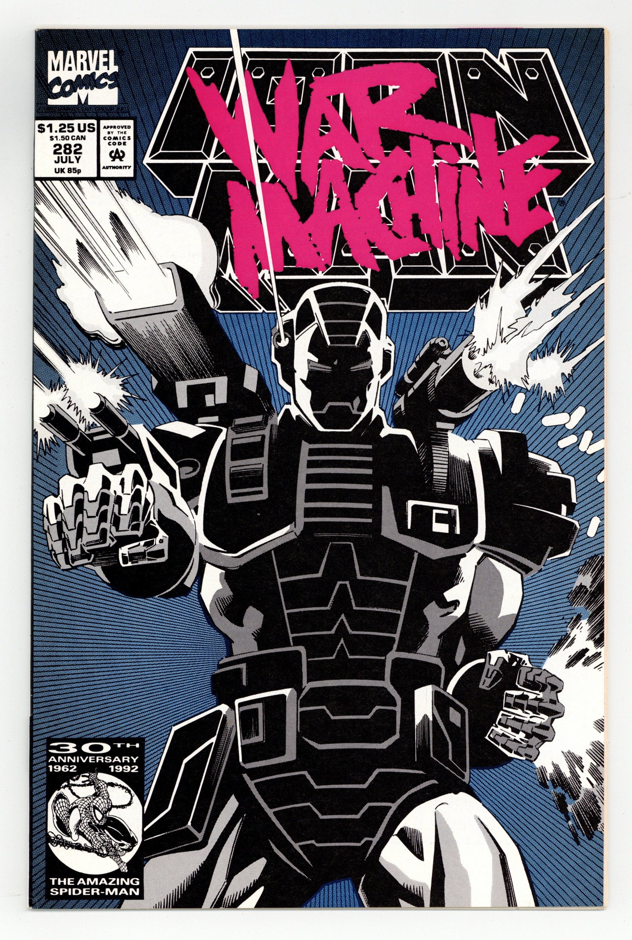 Starts Jan 19 Direct Edition. "War Machine" Part 2 of 3. First (full) appearance of the War Machine armor. Script by Len Kaminski. Pencils by Kevin Hopgood. Inks by Bob Wiacek. Cover by Kevin Hopgood and Bob Wiacek. The Masters of Silence came to Stark Enterprises last issue looking for a fight! And now the trio is getting one in spades thanks to the War Machine armor! In a remarkable display of firepower; Tony Stark, clad in the new gray & white armor, trounces his would-be assassins! In the meantime, Jim Rhodes contacts SHIELD to learn who framed Stark Enterprises for the deadly accident in Japan! And it turns out to be someone the armored avenger knows very, very well! Cameo appearances by Justin Hammer and Nick Fury. (Note: The cover to issue 282 was reprinted as the cover to Iron Man (1968 1st series) Marvel Legends Reprint 281.) 32 pages. Cover price $1.25.