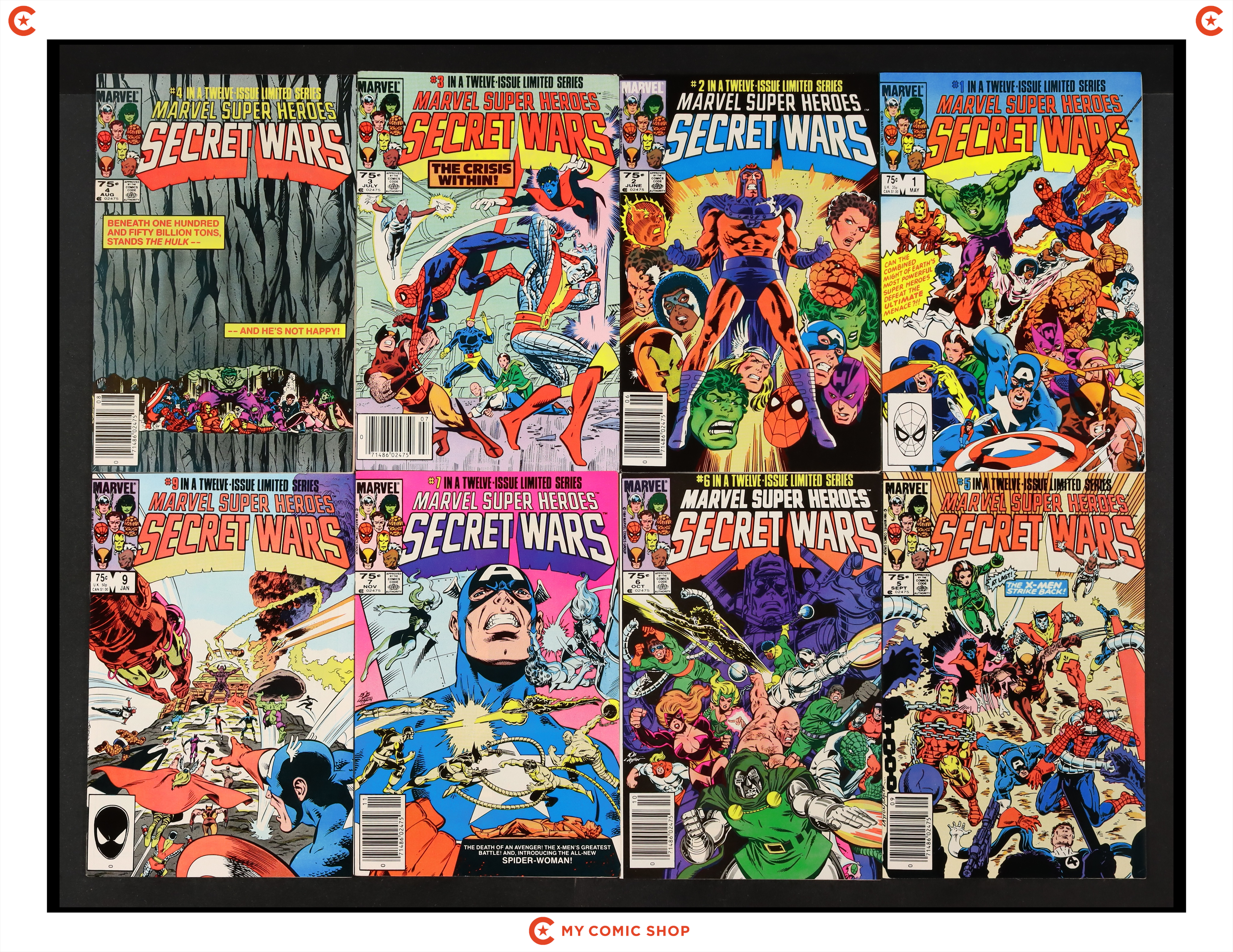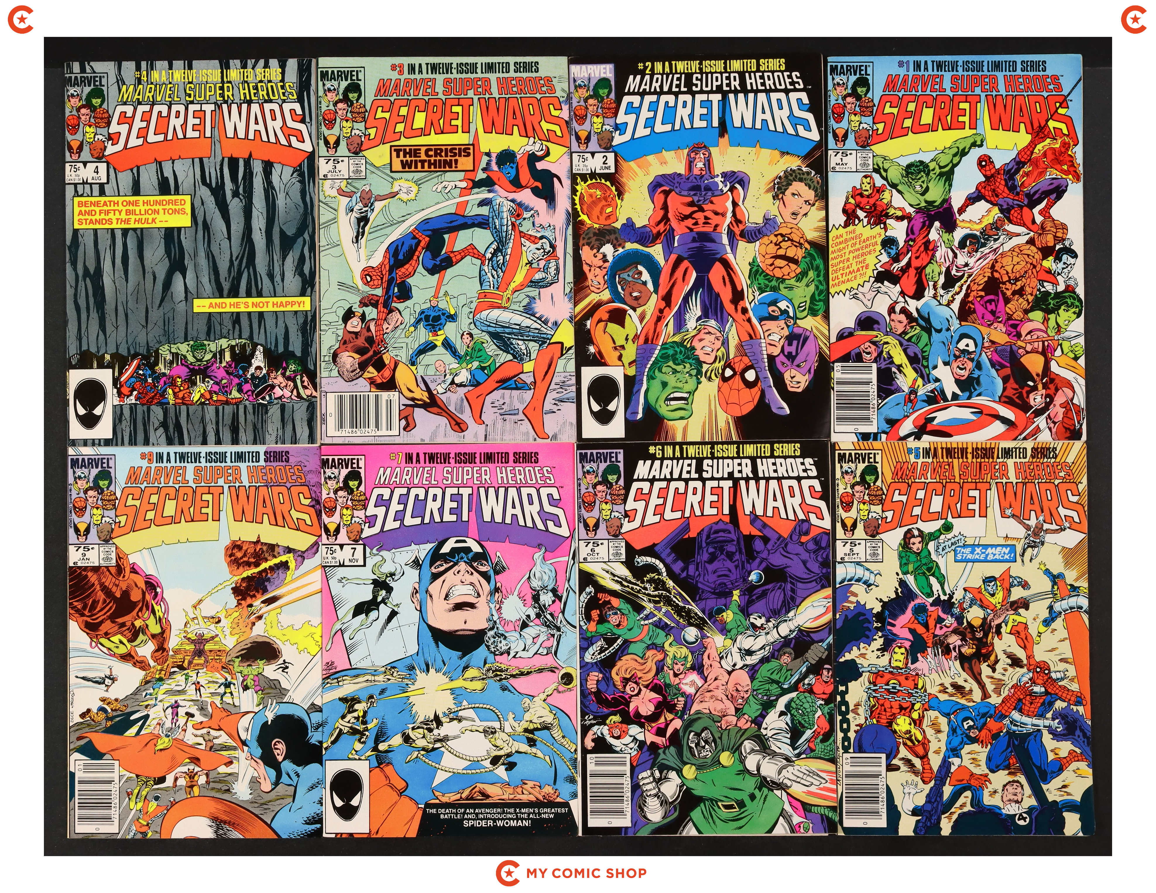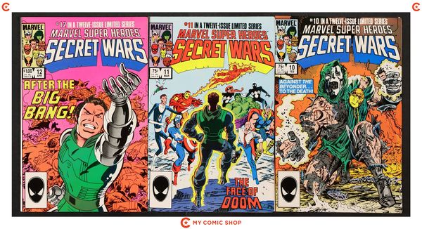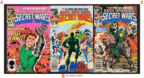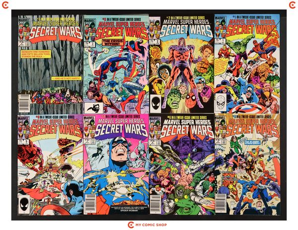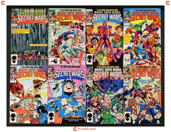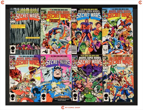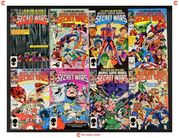 Issues 1-7 and 9-12 of Marvel Super Heroes Secret Wars (1984). Most will grade in the FN range with a few grading VF.