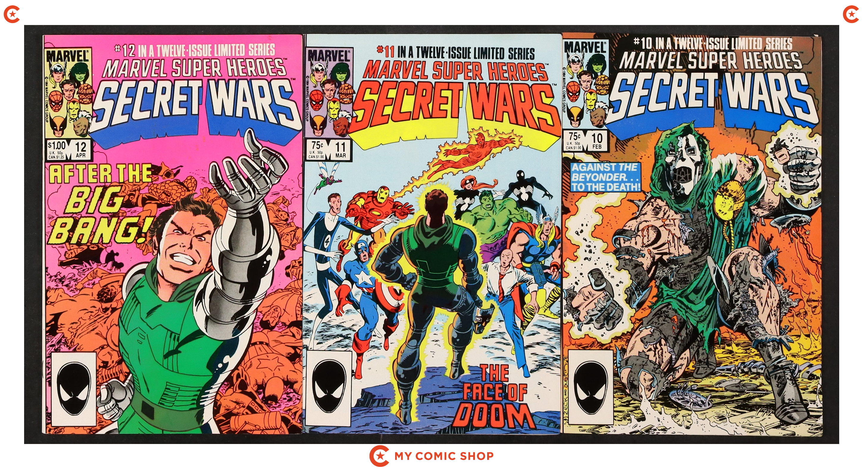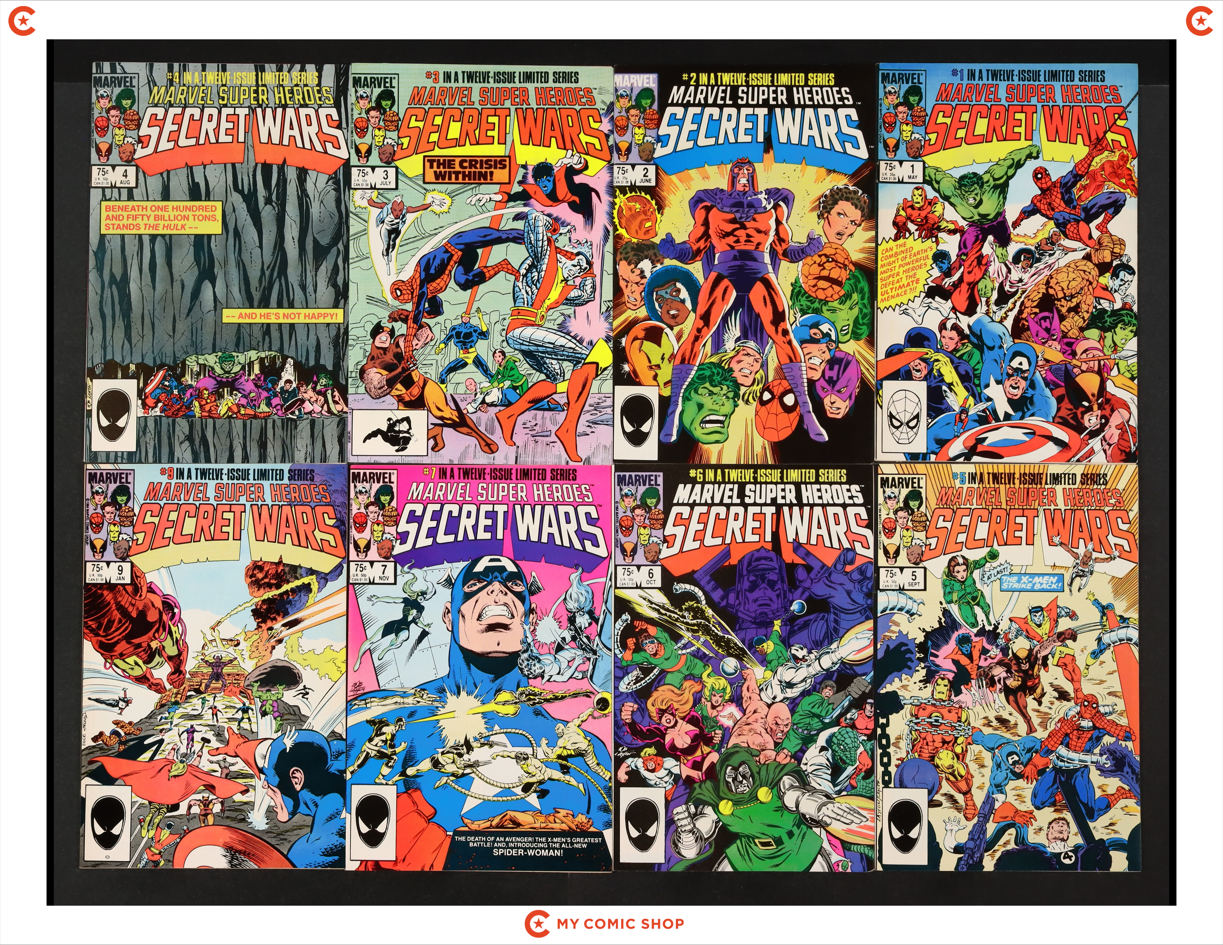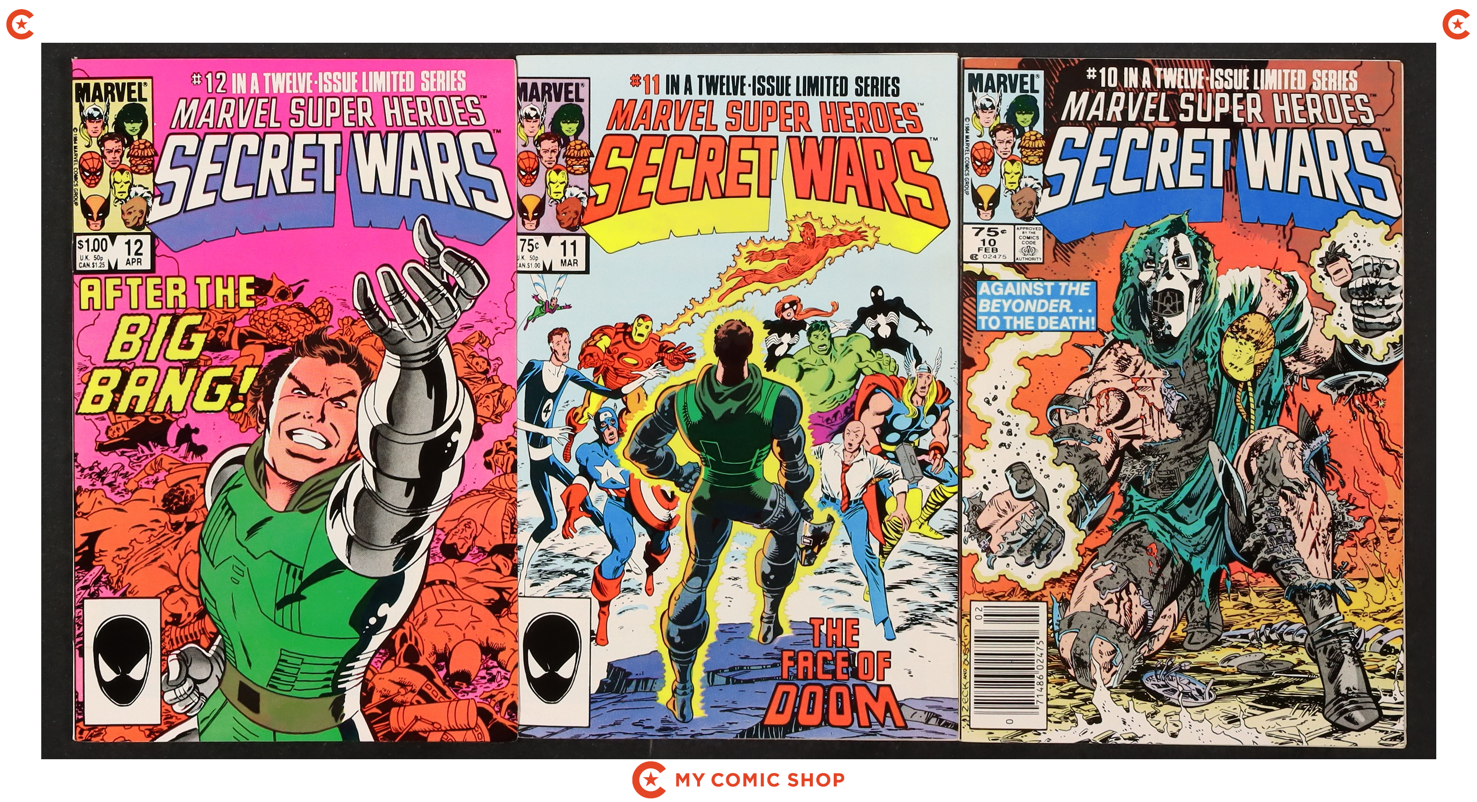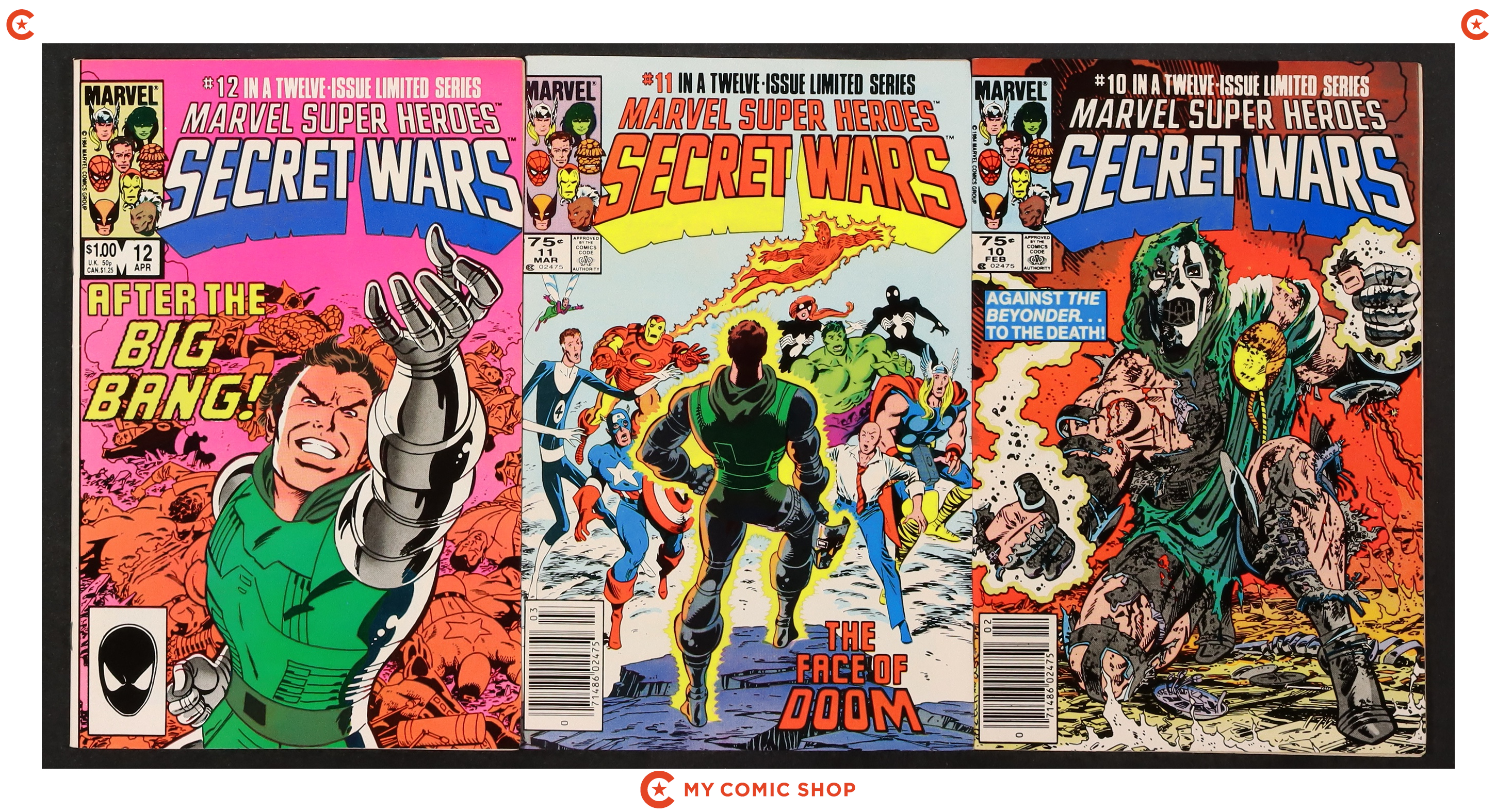 Issues 1-7 and 9-12 of Marvel Super Heroes Secret Wars (1984). Most will grade in the FN range with a few grading VF.