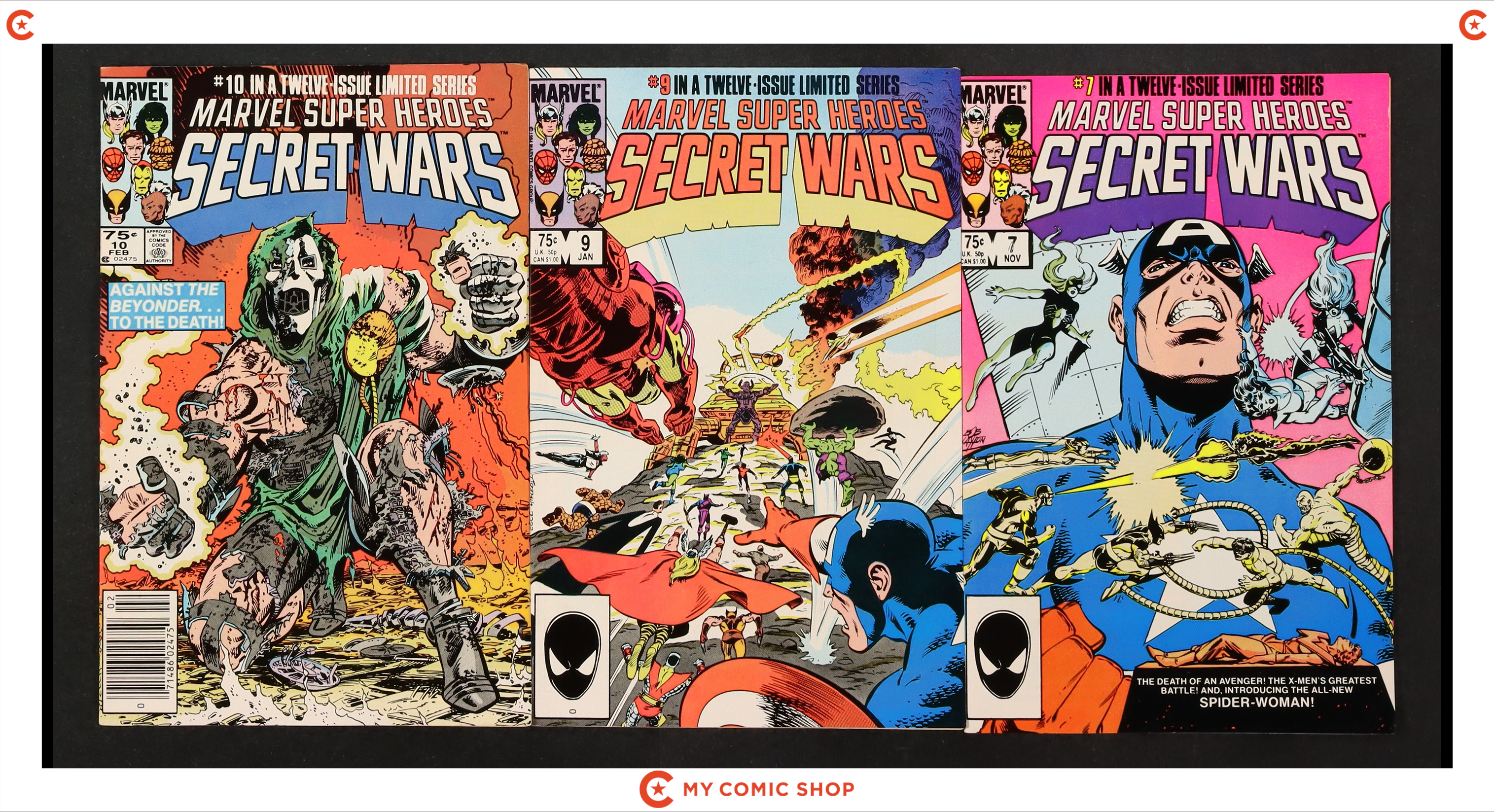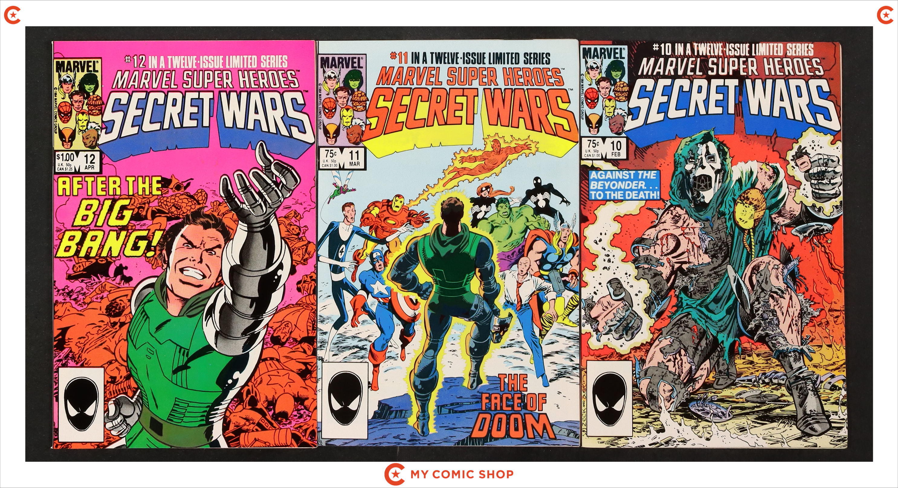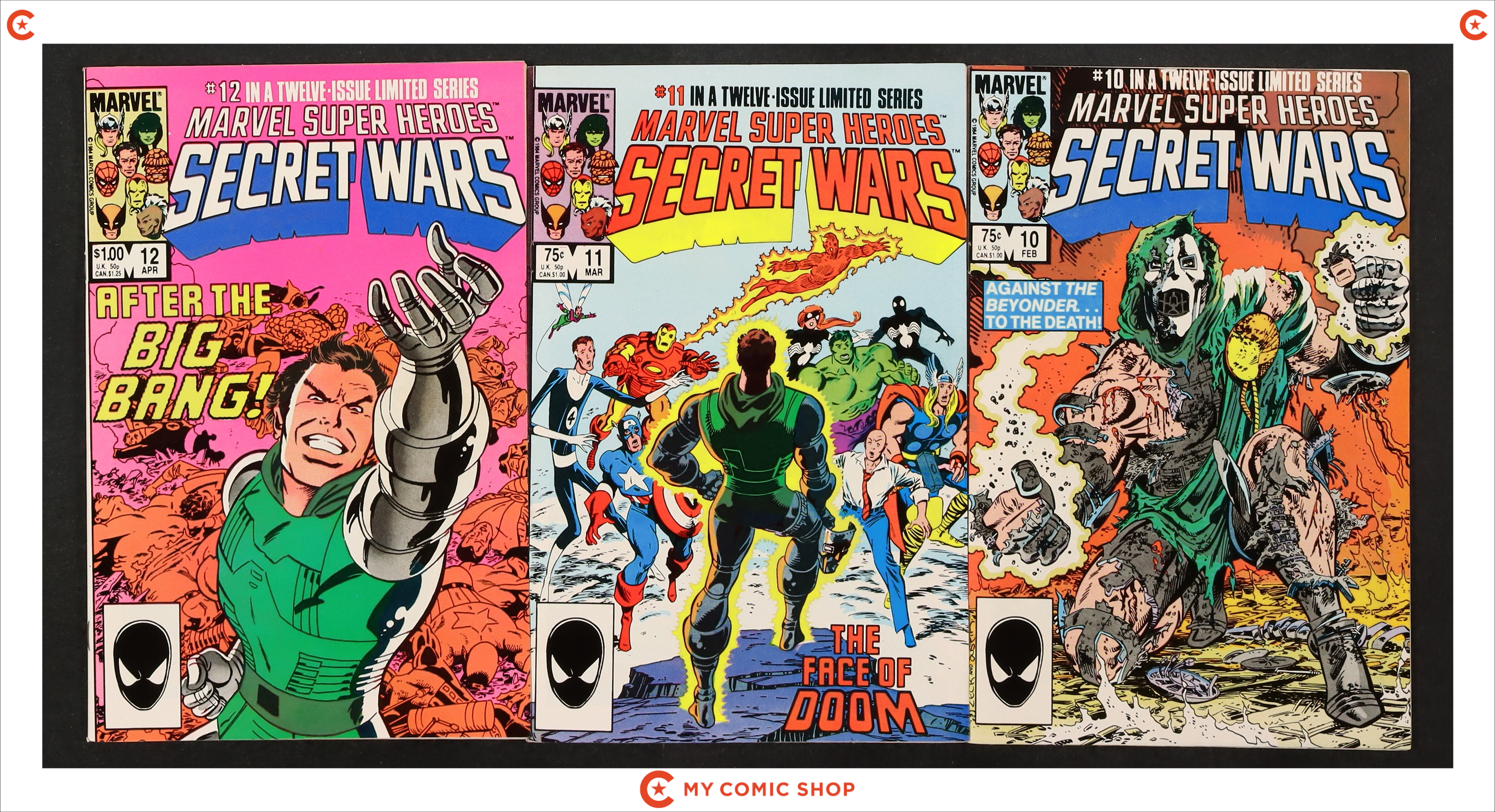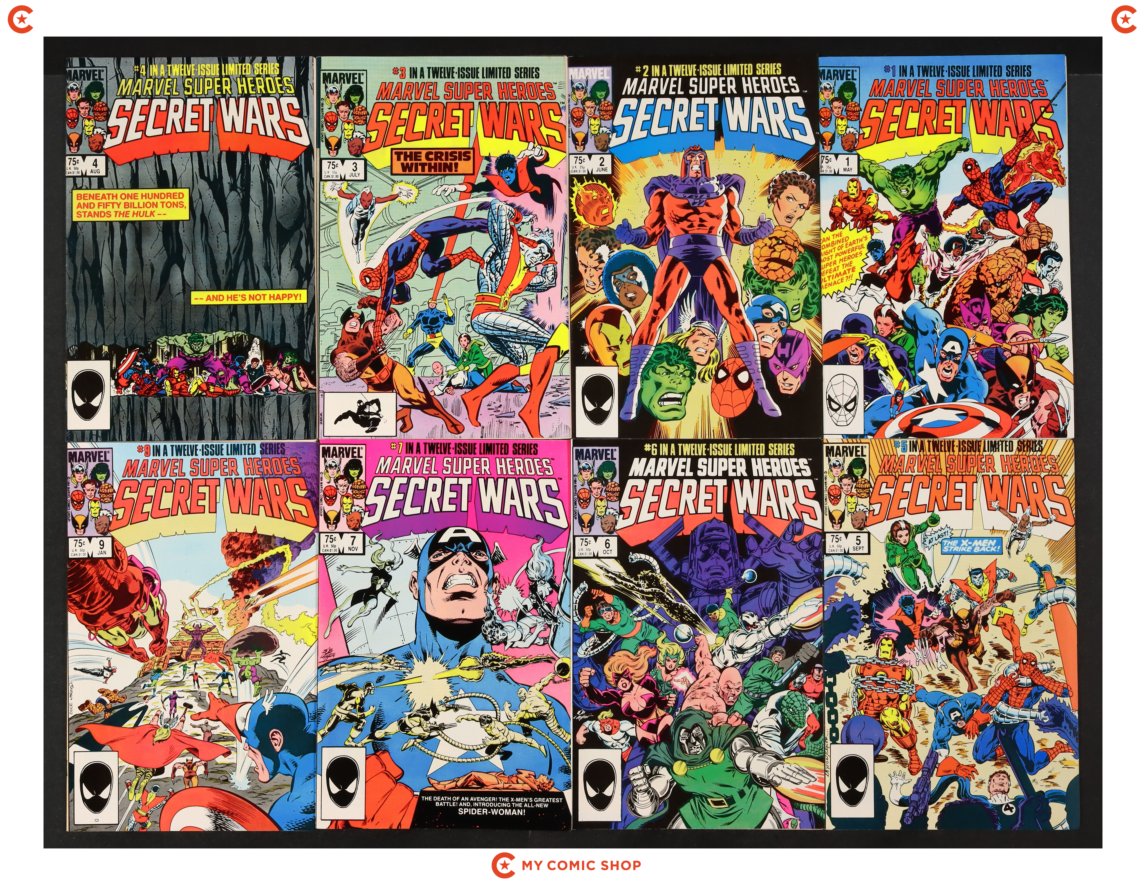 Issues 1-7 and 9-12 of Marvel Super Heroes Secret Wars (1984). Most will grade in the FN range with a few grading VF.